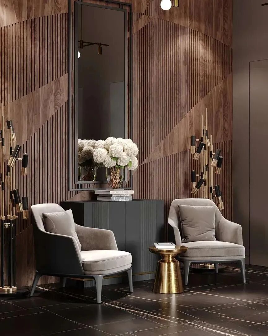 入门处设计师选择了黑色亚光大理石和整体进行相互搭配。让整个空间更加具有格调又突出空间当中的沉稳。