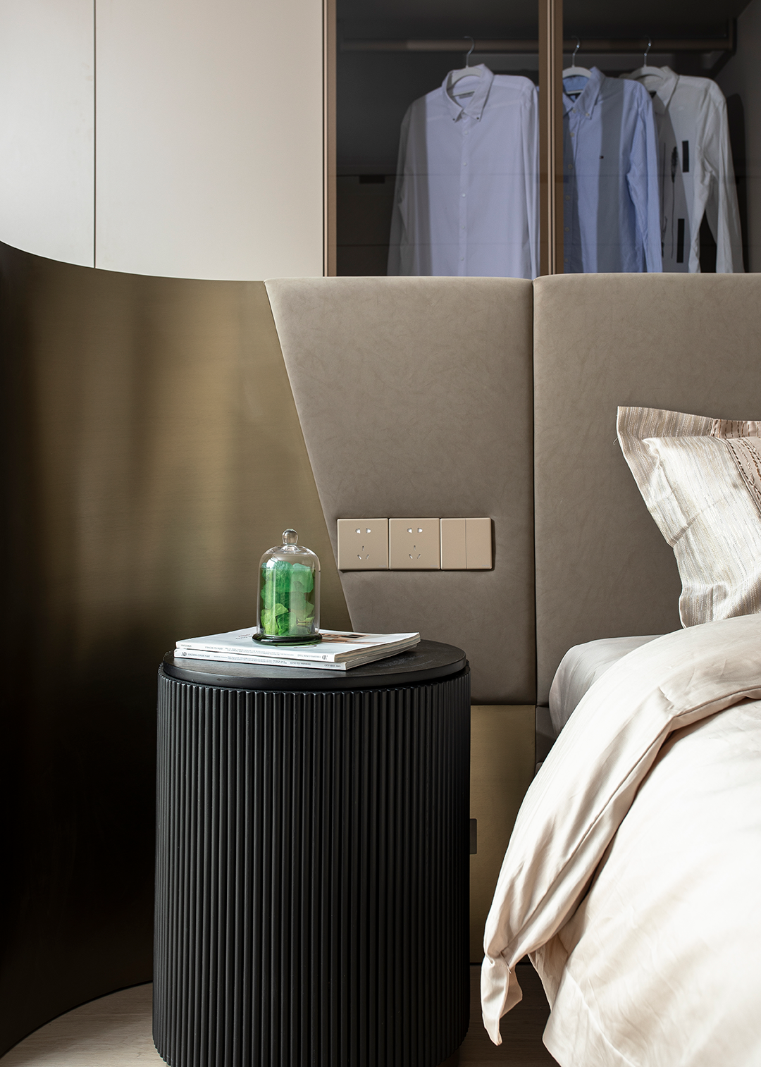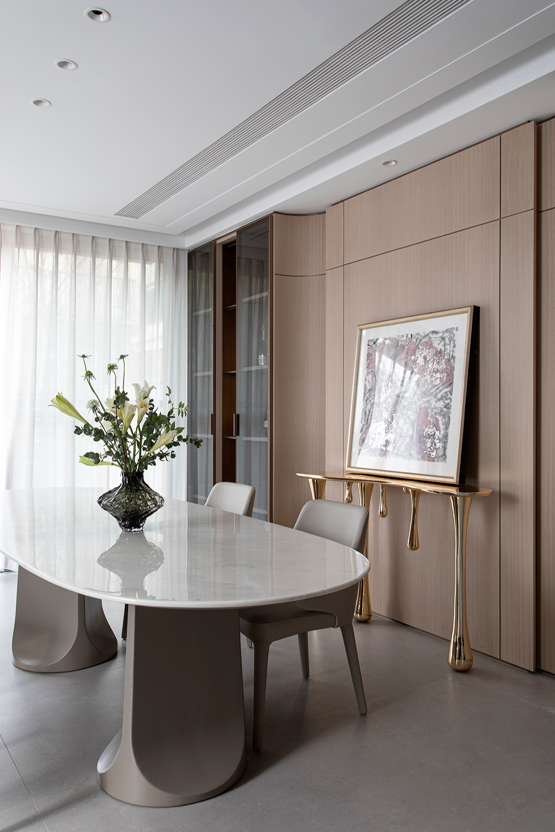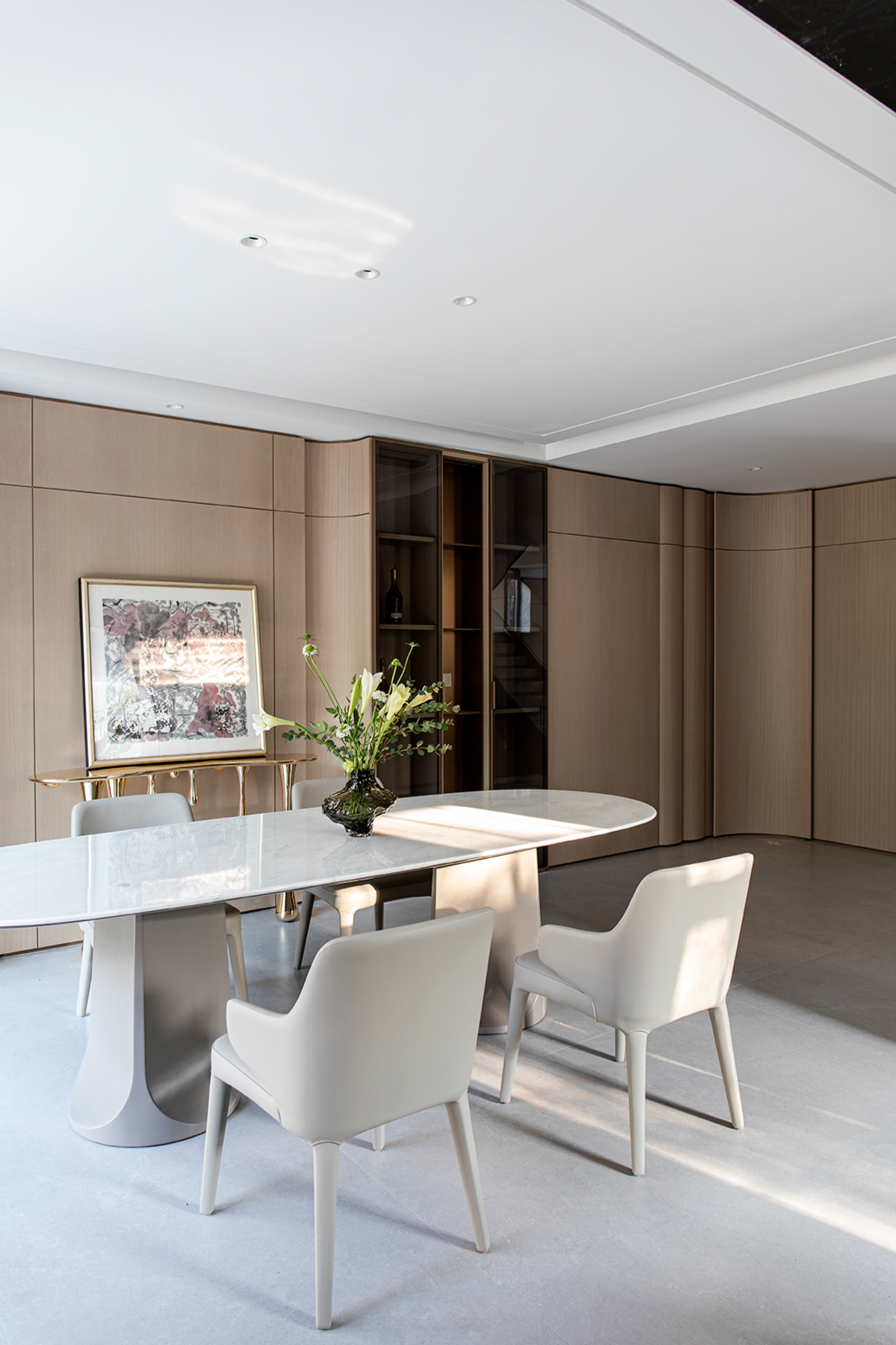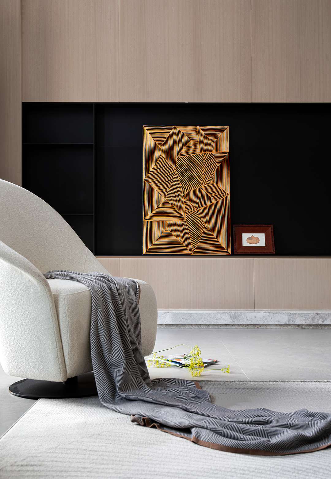 客厅四周以原木色打造了弧线形墙体,减少了棱角的线条,增加了盈润的气息,给每一次休憩带来更多暖意。