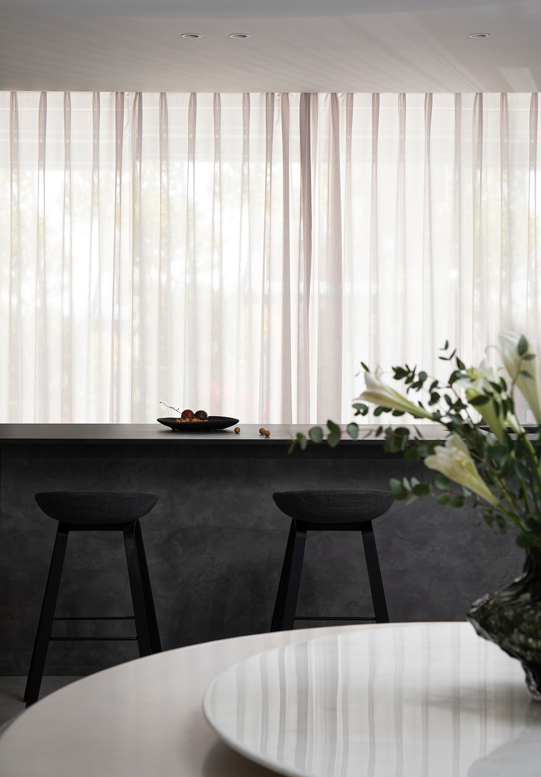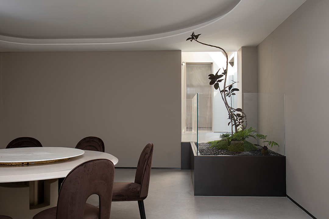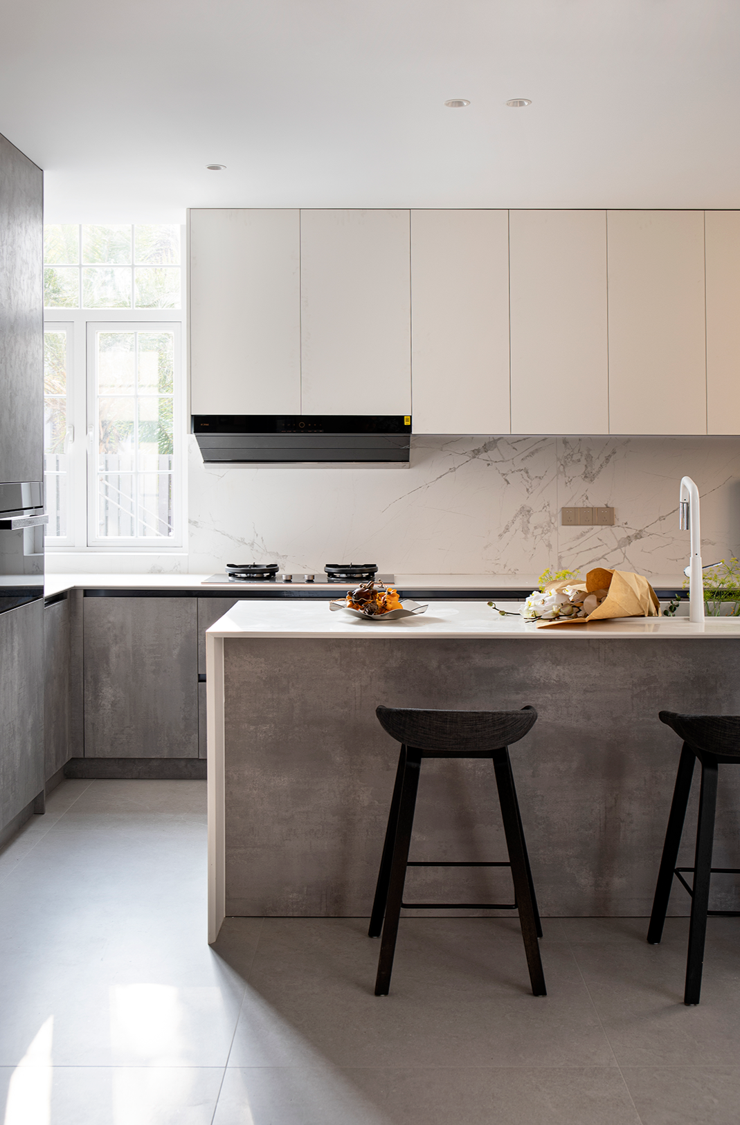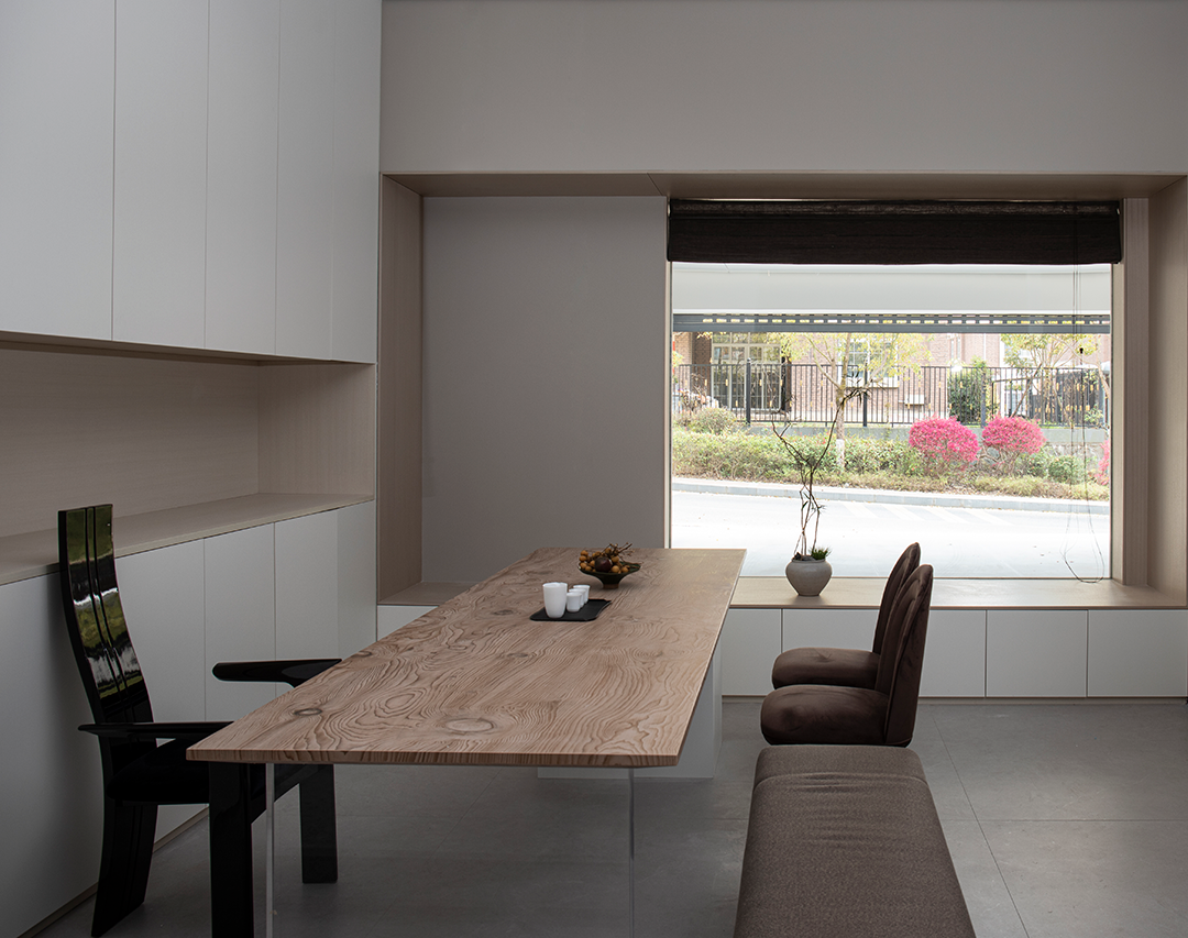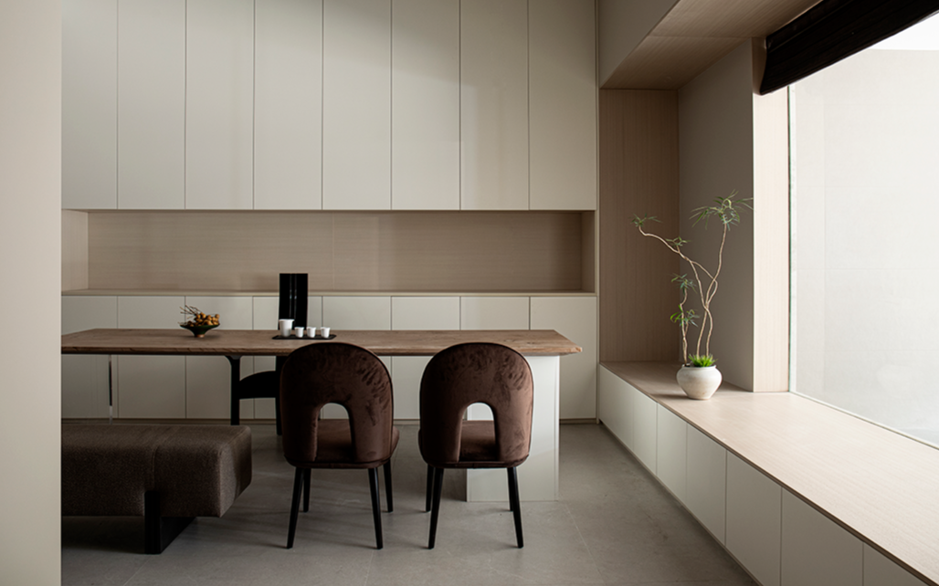 地下会客区迎光而设,水泥色地面与橱柜的质朴给空间铺展大量留白,黑色简约高脚座椅搭配简洁吧台,整体雅致而阔达。