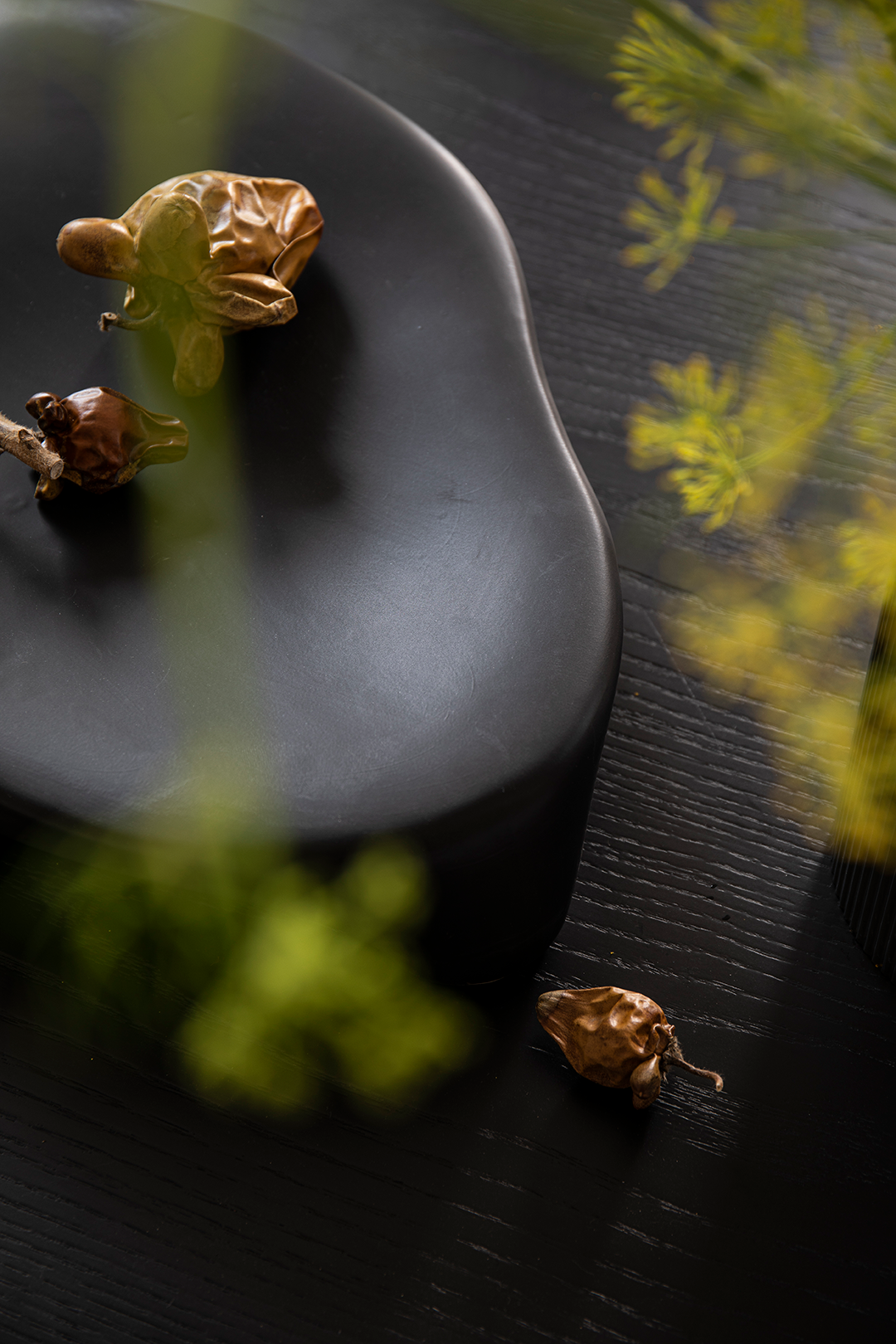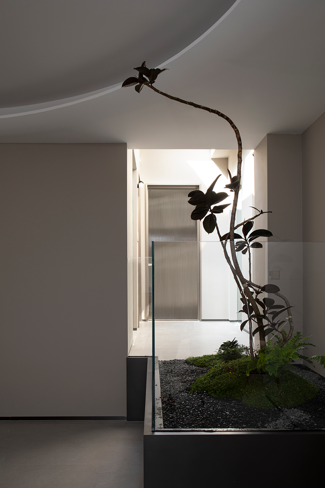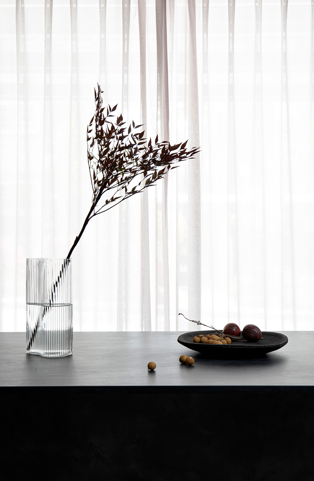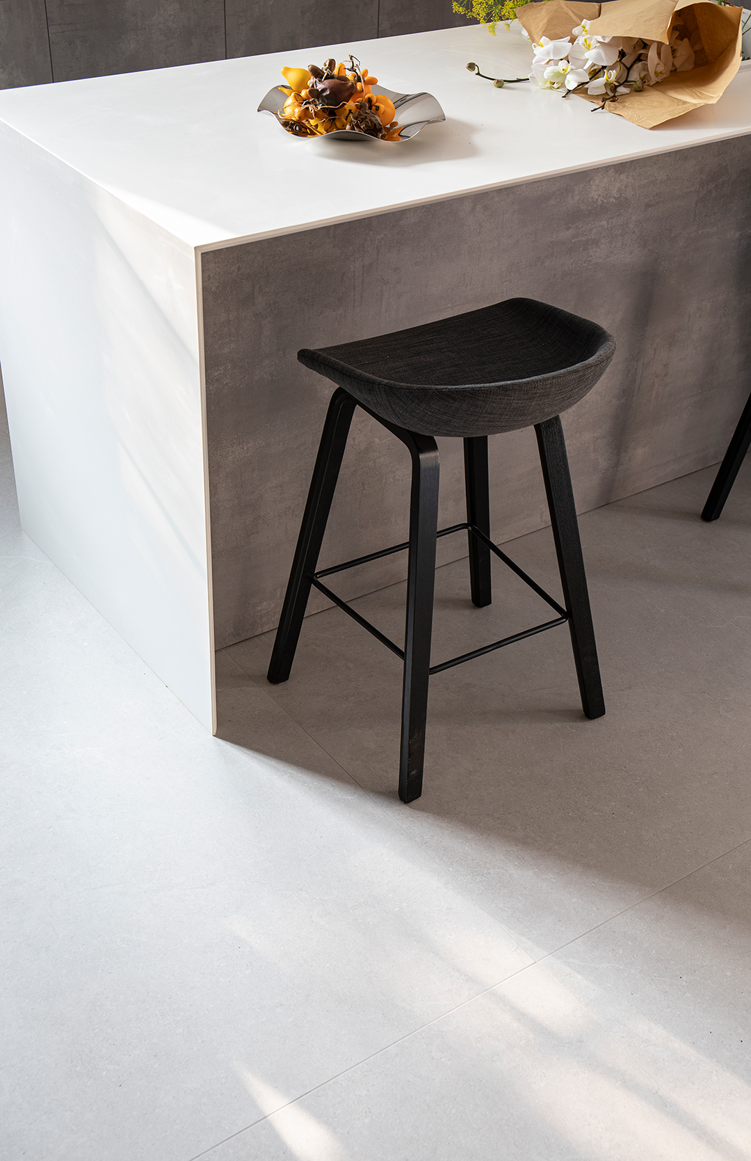 地下会客区迎光而设,水泥色地面与橱柜的质朴给空间铺展大量留白,黑色简约高脚座椅搭配简洁吧台,整体雅致而阔达。