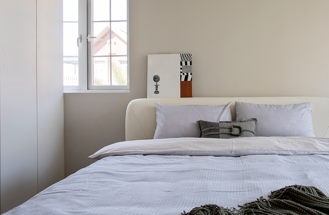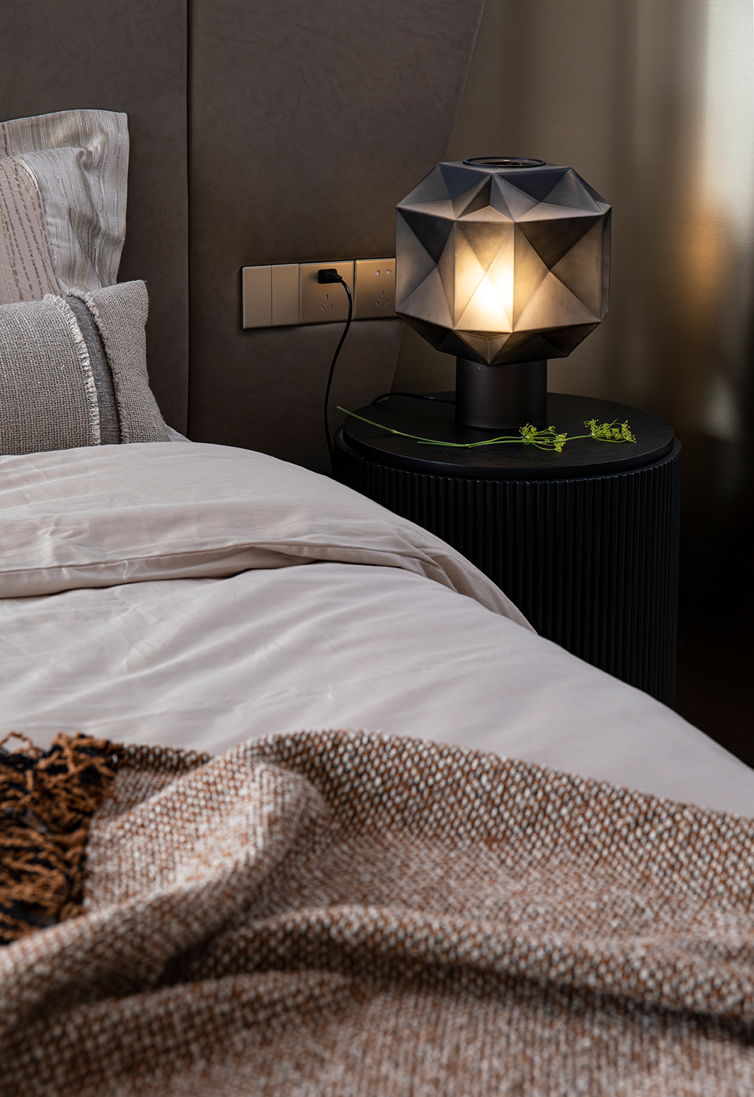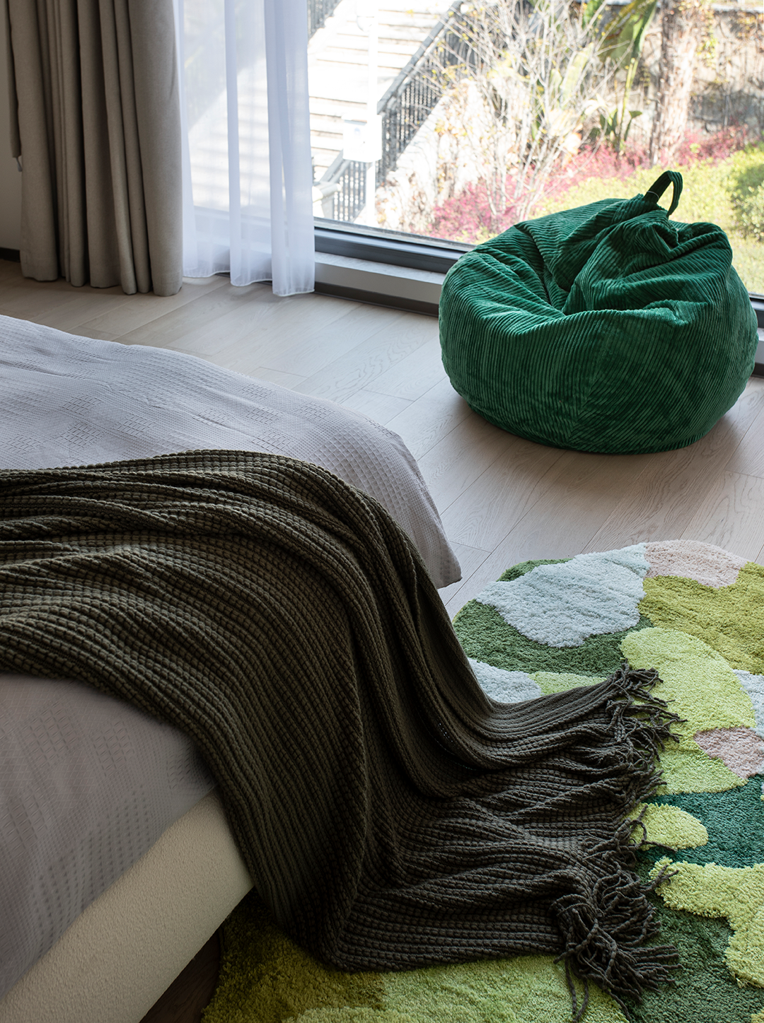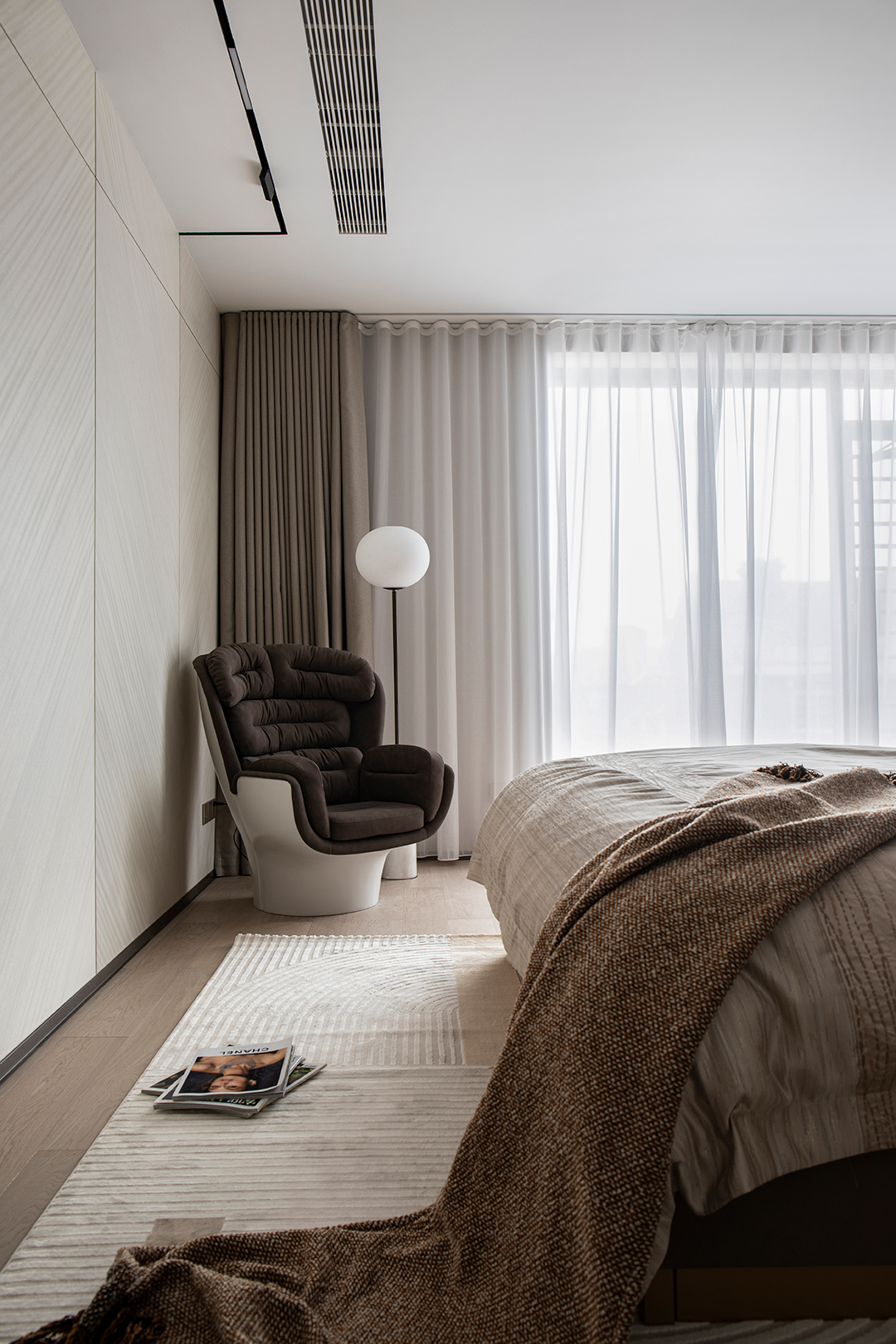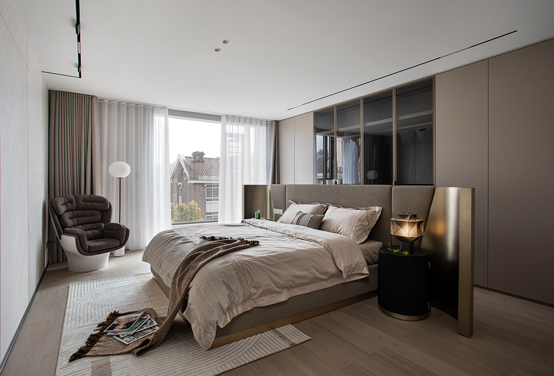 主卧空间以木质地板营造安逸氛围,透过整面的落地玻璃幕墙,遥相呼应山间的葱翠风景,足不出户也能感受到山野森林的诗意。