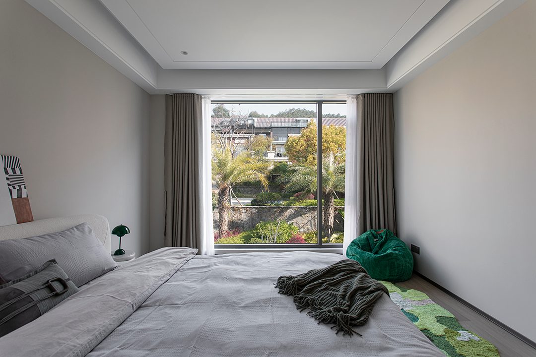 儿童房的设计相较而言更为通透,当自动窗帘随太阳升起而缓缓拉开,一镜到底的山境便纳入眼底。