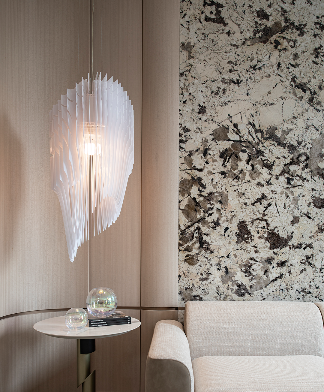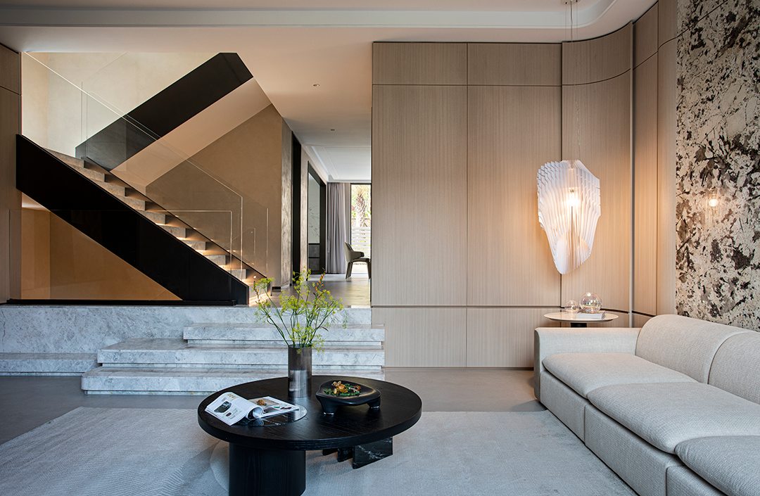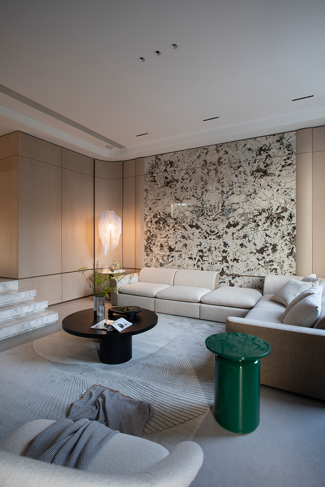 入户路径浅浅迂回,沙发后的奢石背景墙繁花绽放,与白纱窗外的山景呼应,散发出静美婉约的气质。
