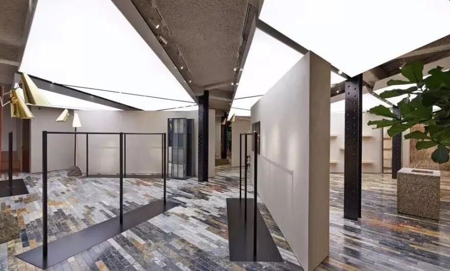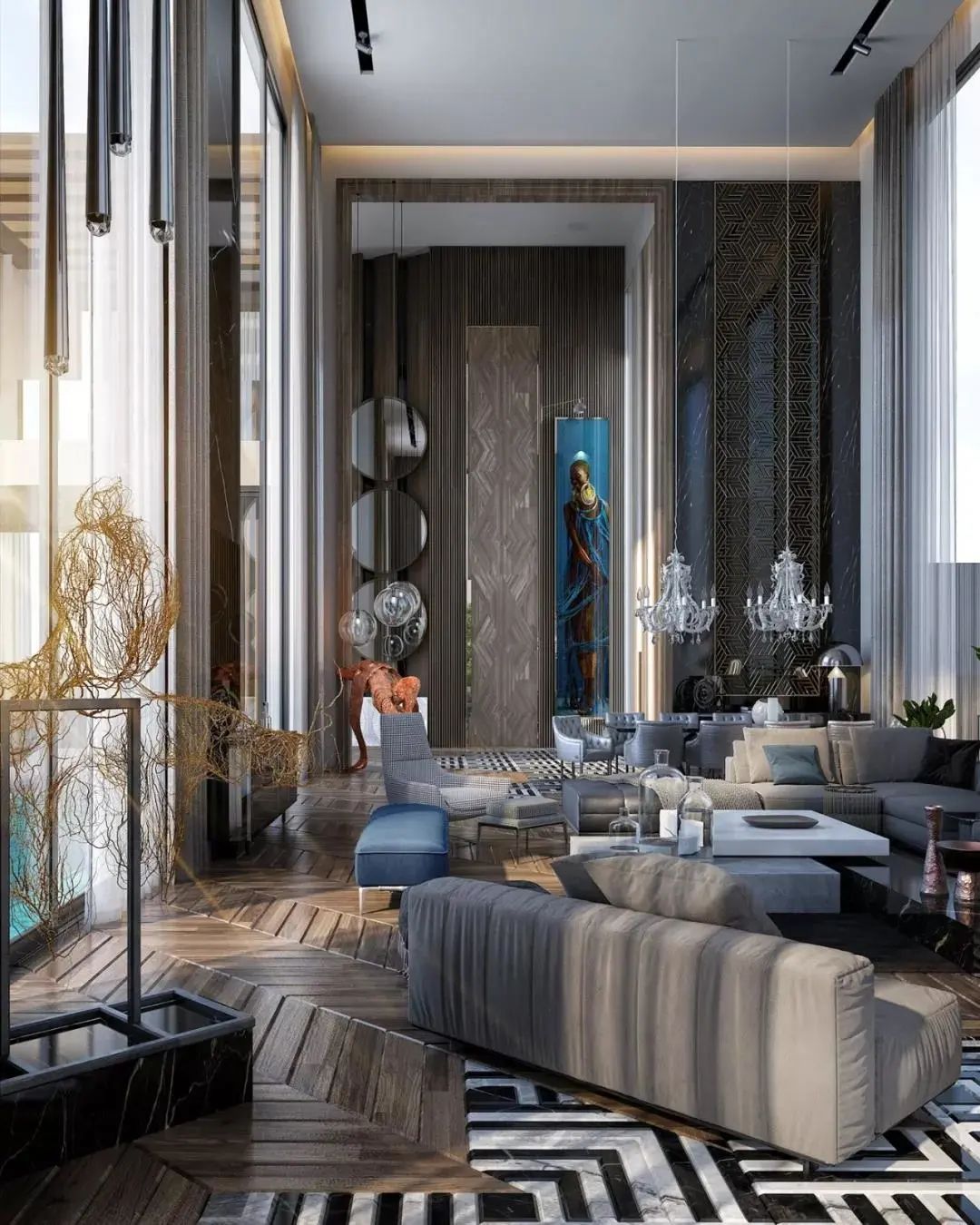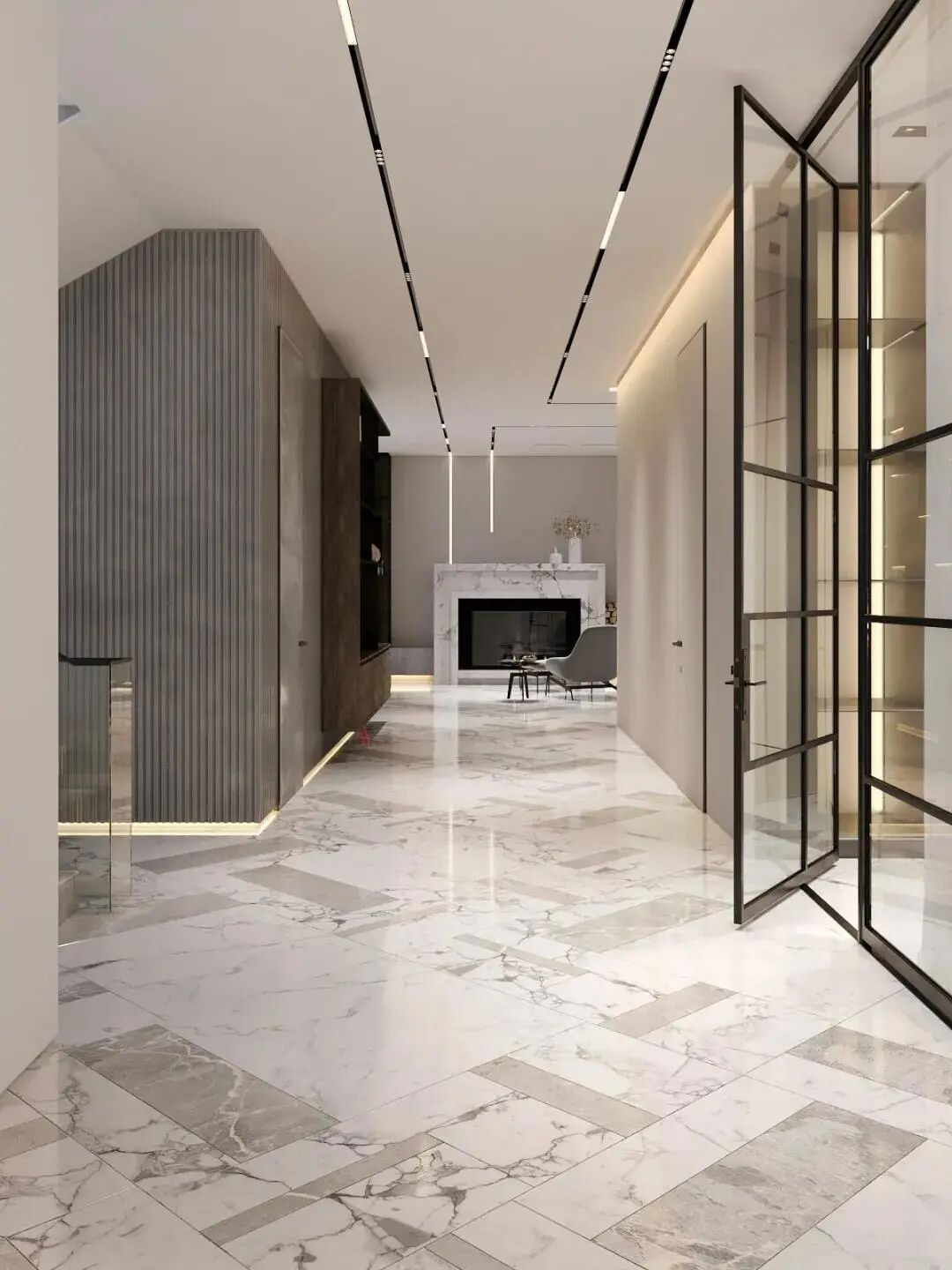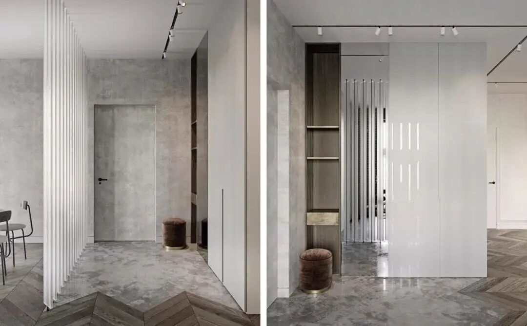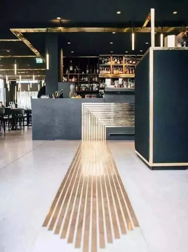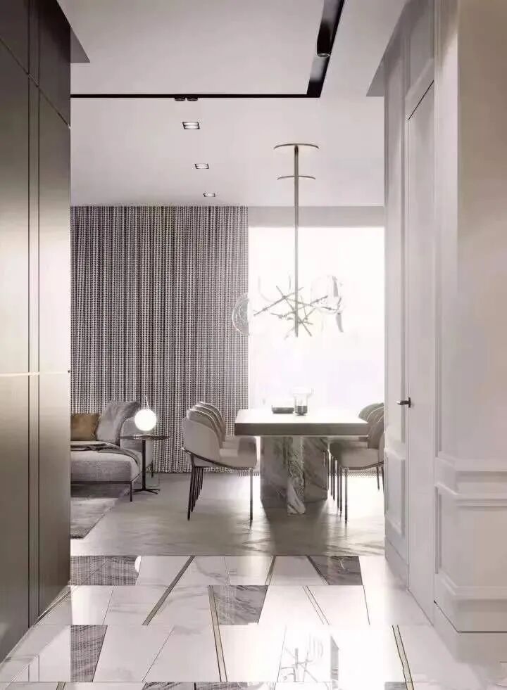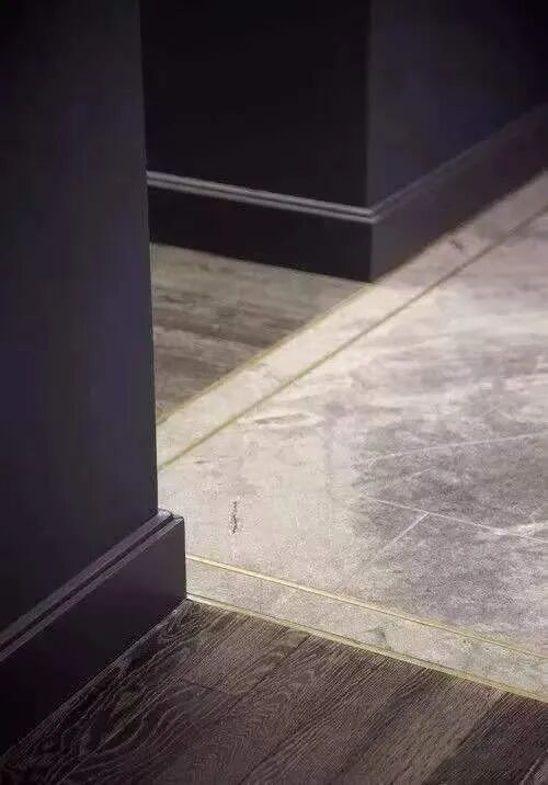 木地板与大理石拼接,不规则的穿插拼接带来更多创意,常见的人字形、鱼骨型,打破呆板,丰富空间设计感。不同的材质运用在不同的空间,通过地面的材质不同发生空间转换。
