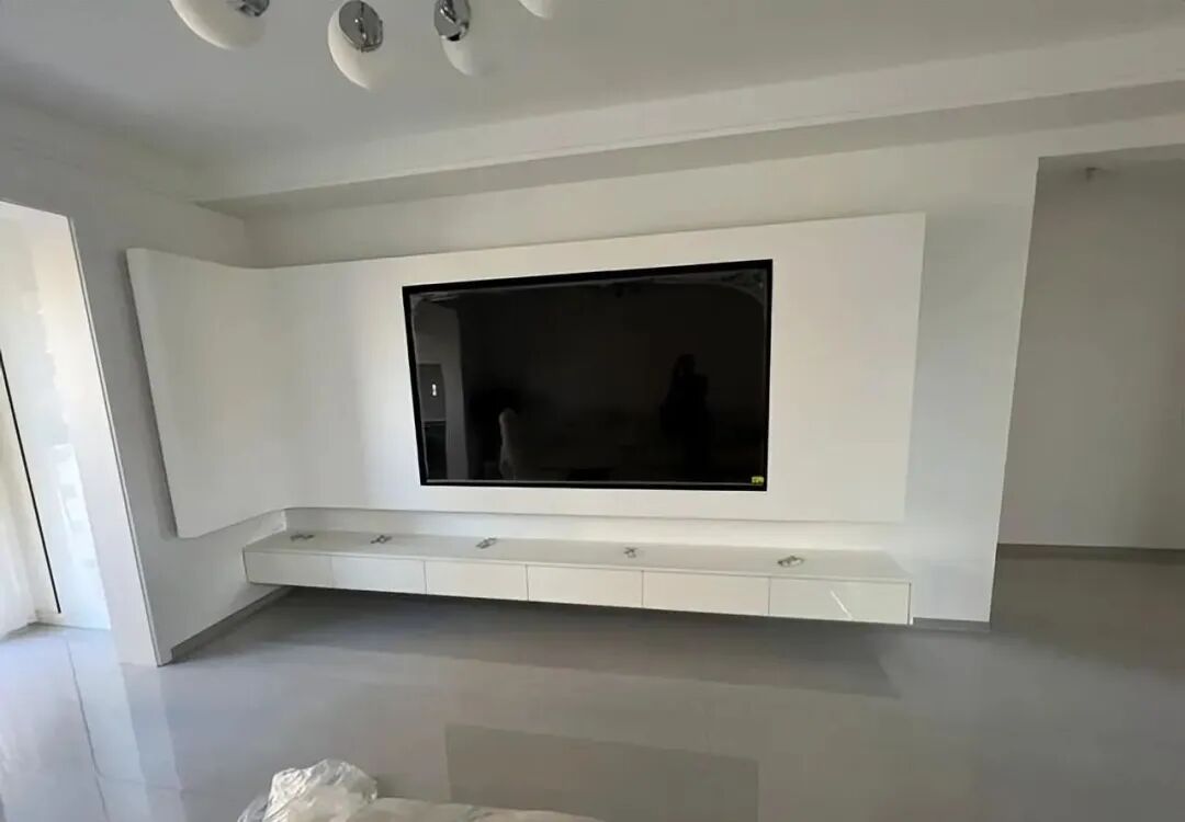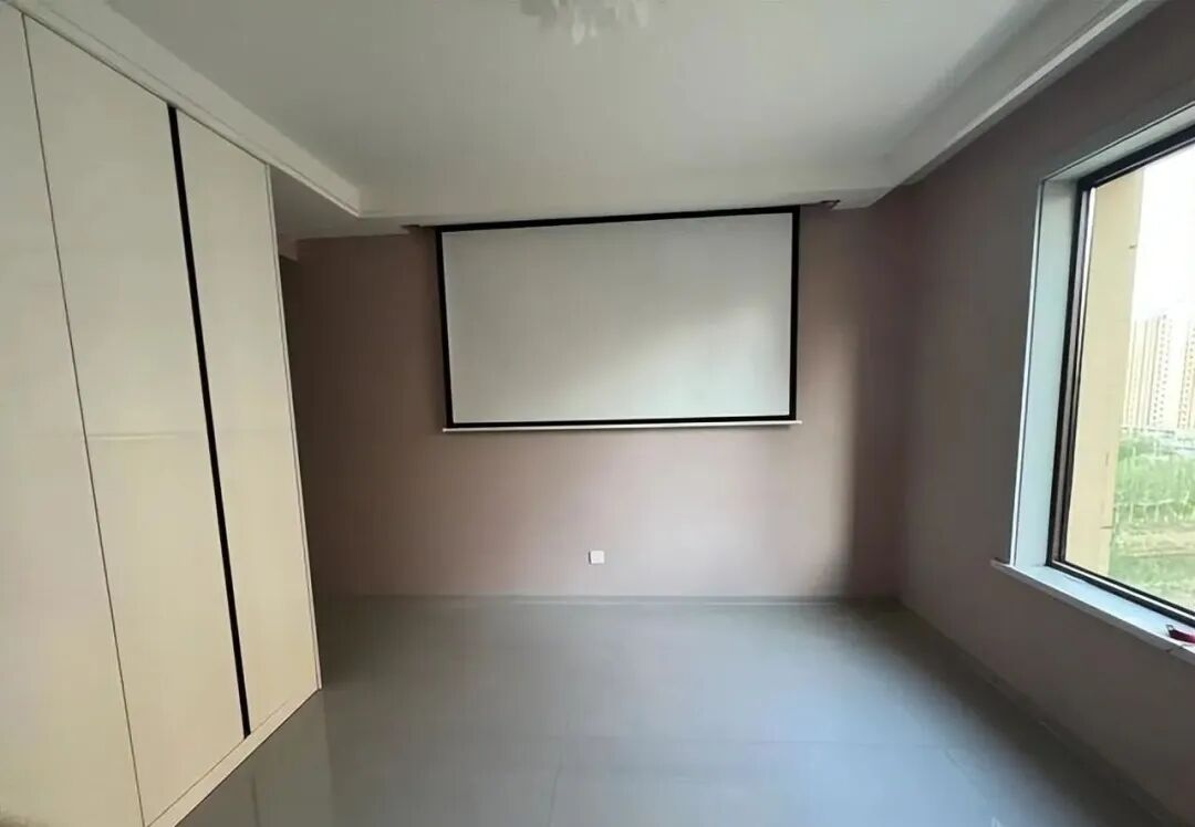 主卧小细节,墙上安装了伸缩的投影幕布,以后搬进来入住了,可以躺在床上很舒服的观看喜欢的电视或者电影呢,很会享受啊。