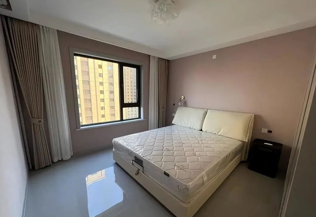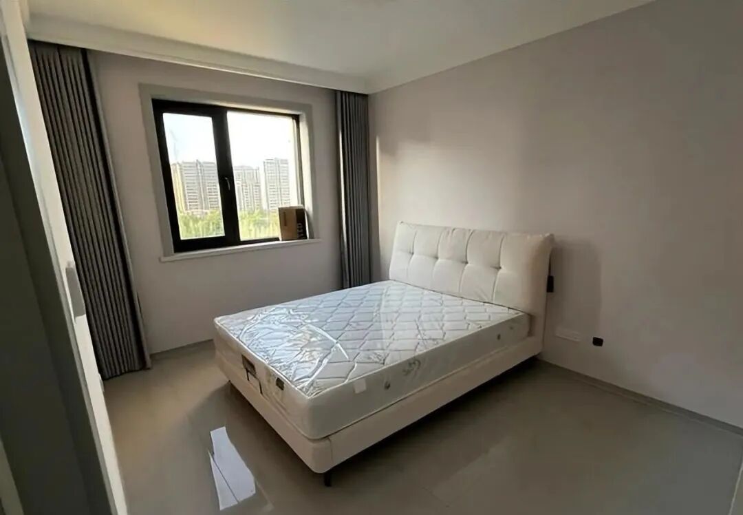 次卧就比较简单了,顶面没有安装吊顶,但是窗户的位置做了窗帘盒,看起来更好看。床已经布置进来了,搭配的床垫很喜欢。地面都是选择了灰色的瓷砖,很耐脏,也很耐看,搭配更容易出效果。