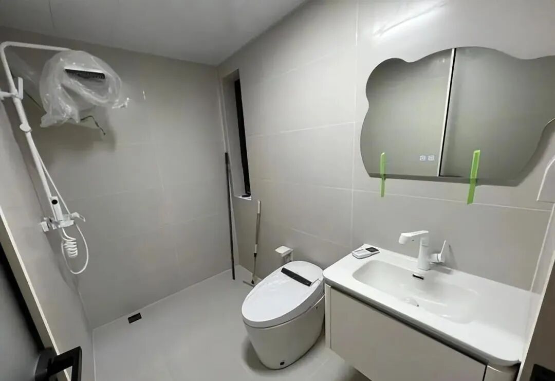 卫生间空间小,考虑到是主卧,所以没有做干湿分离,显得空间还是很宽敞的。安装了智能马桶,并且镜子颜值很高,非常值得拥有呀。墙面与地面都是灰色的瓷砖,非常喜欢,很值得参考!