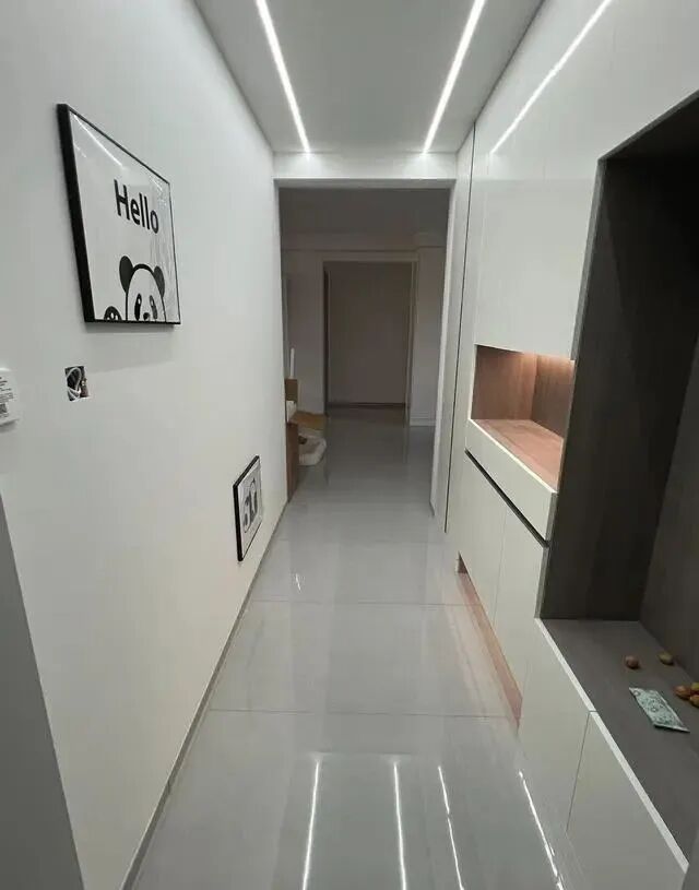 南北通透的户型还是比较让人喜欢的,从入户进来有独立的玄关,根据家里需求设计了上下两层自带换鞋凳鞋柜,不仅仅方便使用,而且储物空间足够强大呀。非常典型并且合理的入户鞋柜,非常值得参考。柜门是白色的,显得很干净。顶面安装了灯带,这种灯光出来的效果很好看,让人一进来看到就很喜欢呀。