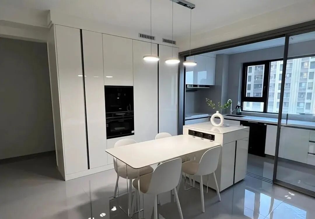 餐厅设计了岛台,与方形餐桌刚好搭配起来,显得很时尚,很大气。旁边定制了非常实用的餐边柜,可以提供更多的储物空间。在设计餐边柜的时候,设计了嵌入式的家电,真心不错。