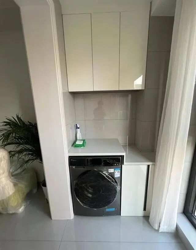 阳台这边位置定制了柜子的时候,预留了可以放洗衣间的位置,洗衣物会方便很多,显得很有设计感。墙上安装了吊柜,可以增加蛮不错的储物空间呢。定制的柜子显得很有档次,柜门带亮面的,有点反射效果非常好看!
