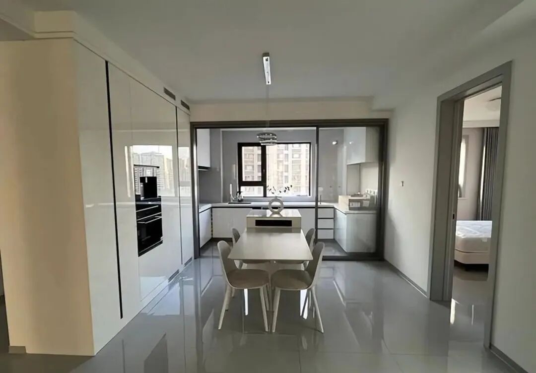 这是餐厅,布置了一张方形餐桌,占用的空间大小位置合适。其实,如果选择圆形餐桌的话,空间也是足够的。旁边就是厨房了,煮好的饭菜可以很快端出来,方便用餐。