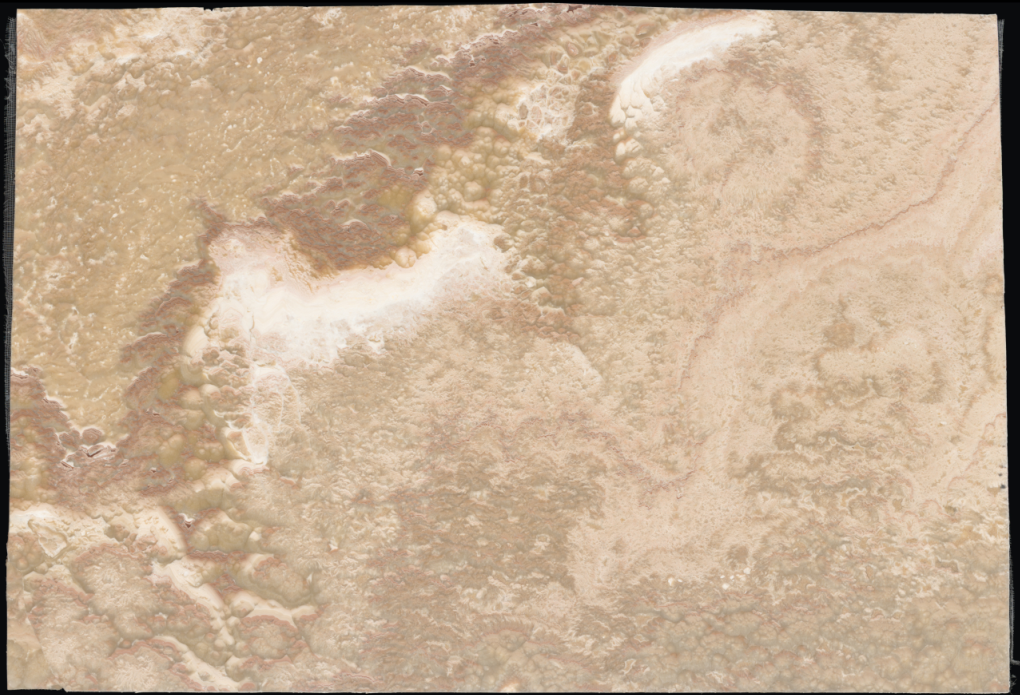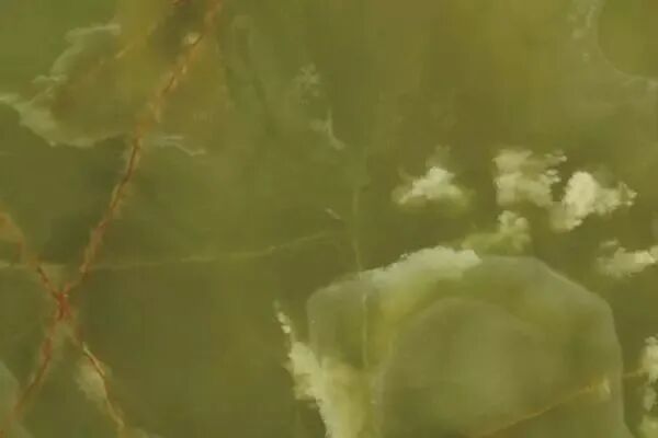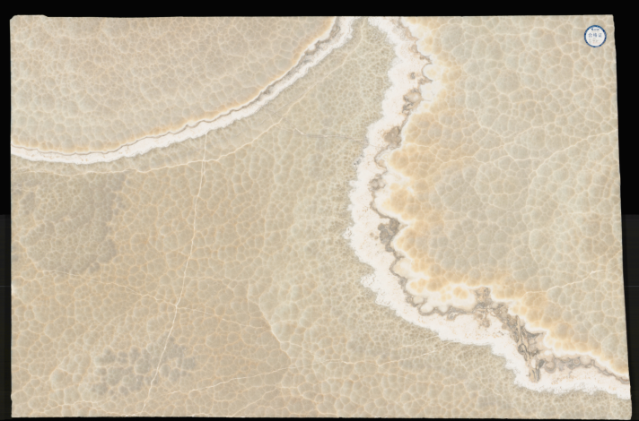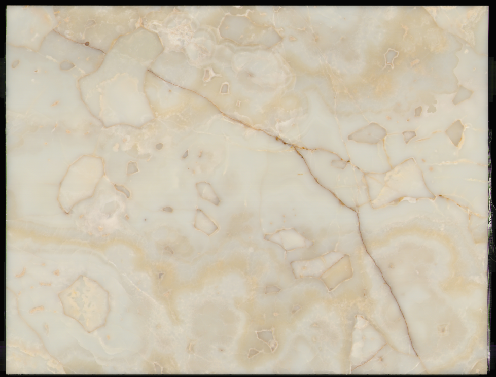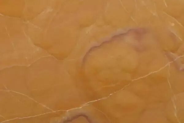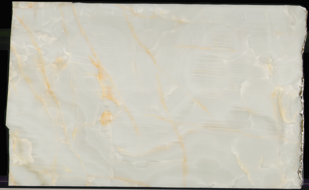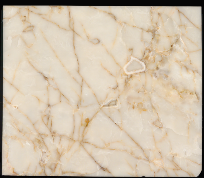 产自伊朗,底色呈乳白色,透白色,黄线黄纹较多,裂纹较多,无孔洞,石质细腻,通透性强。