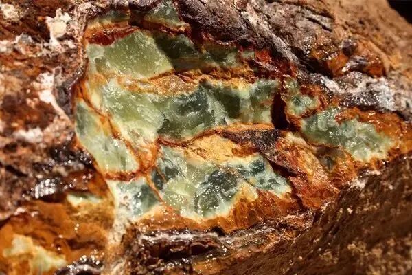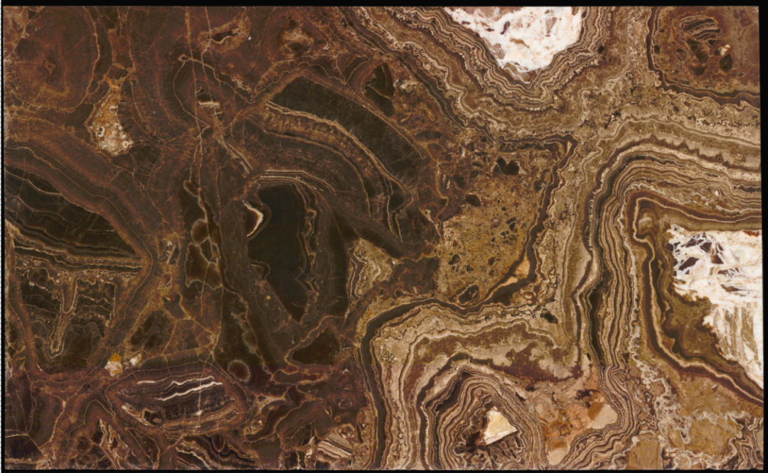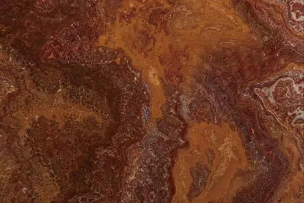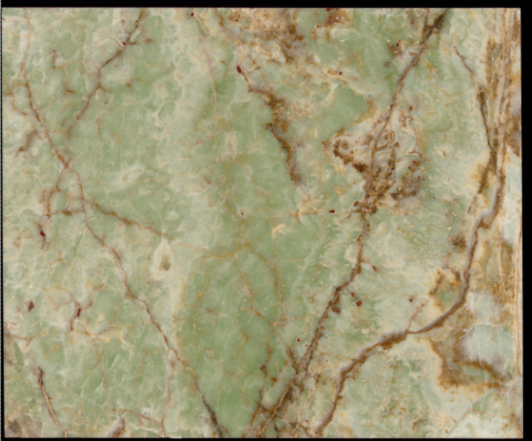 产自土耳其,底色为红褐色或咖啡色,版面有点状玉质、纹状玉质分布,局部带有 大块黄褐色斑纹。裂纹少,较多细小孔洞,石质较粗疏,通透性弱,局部带有纹状玉质部分有通透感。