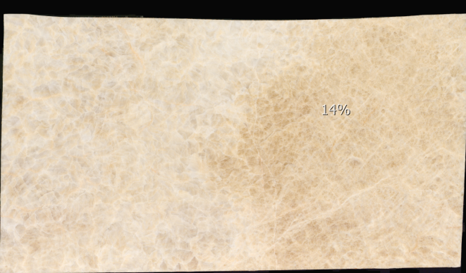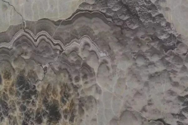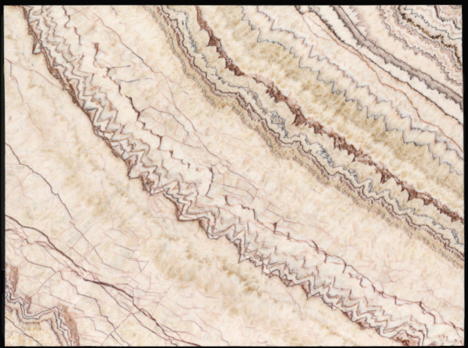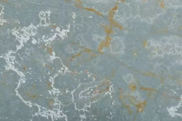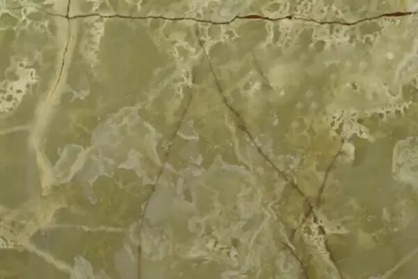 产自伊朗,底色分为白底、黄底,现较多为黄底,即黄褐色底色,版面带有灰黑 色朵状纹理交错,呈山水画状分布,局部带有褐色斑纹,黑褐色根线。裂纹较少,无孔洞,石质较为细腻,通透性好。