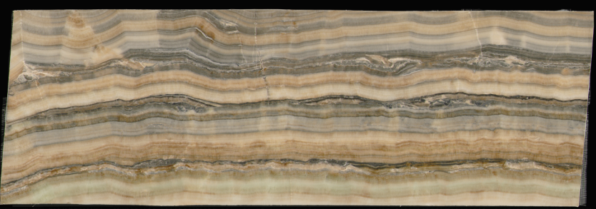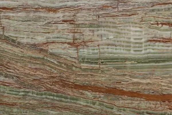 产自巴基斯坦,底色为绿色、黄褐色、白色条纹相见呈横向纹理,绿色条纹较多,版面中有纵向黄褐色根线及少部分裂纹,横向纹理局部有错落整齐。孔洞较多在黄褐色根带中,石质一般,绿色、白色部分通透性好。