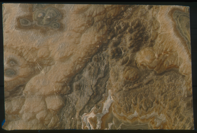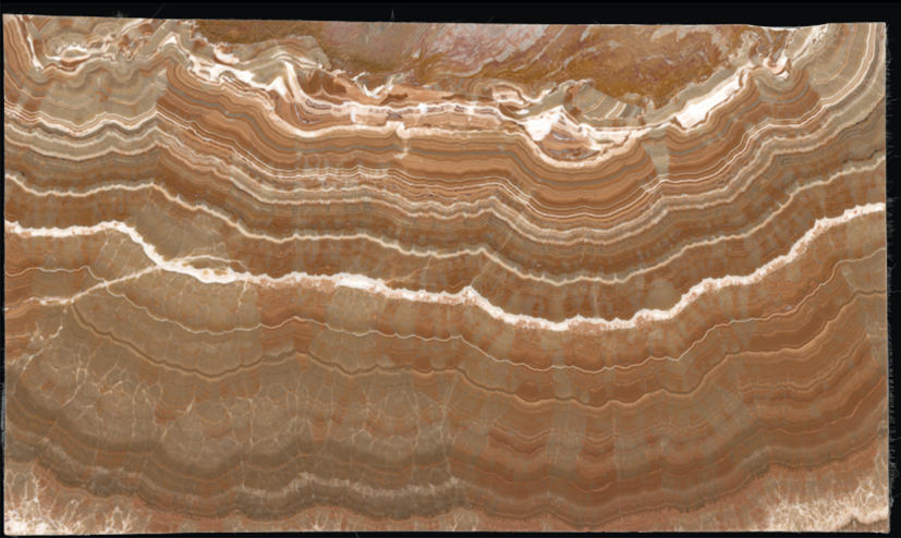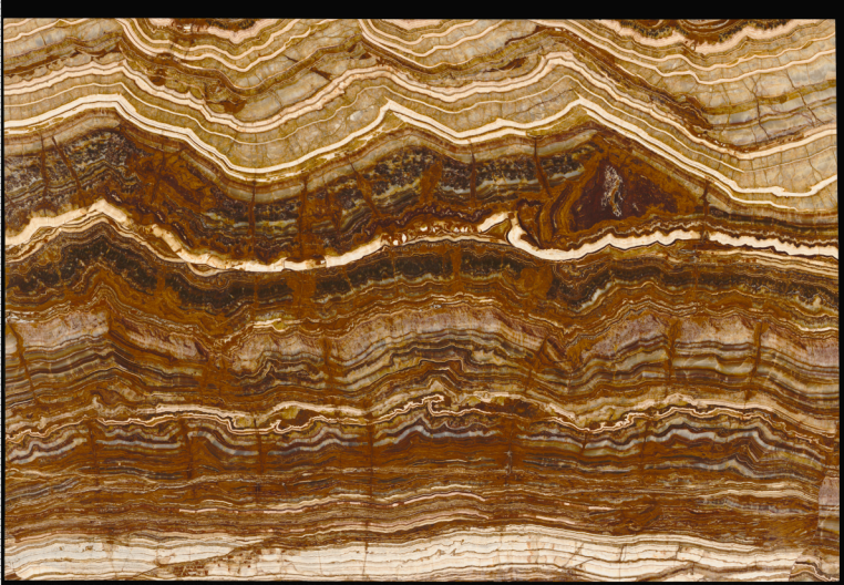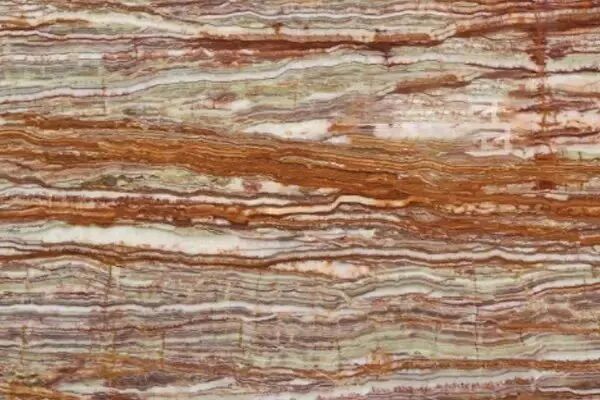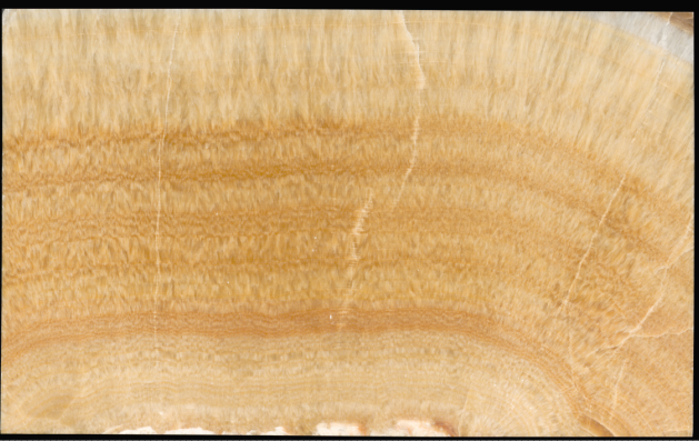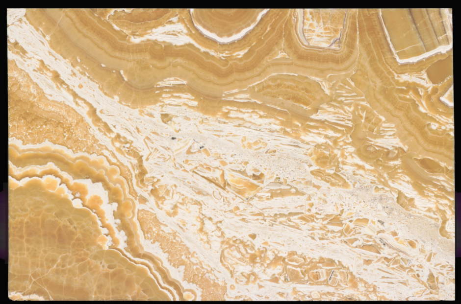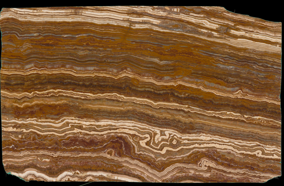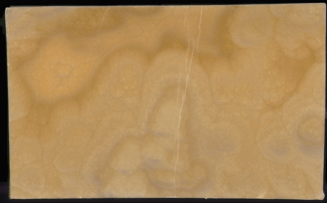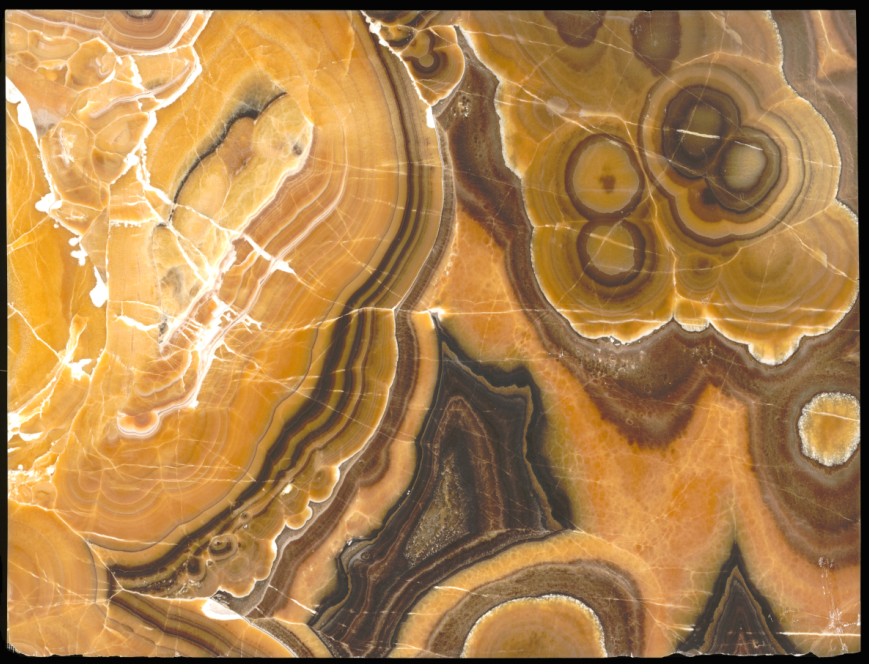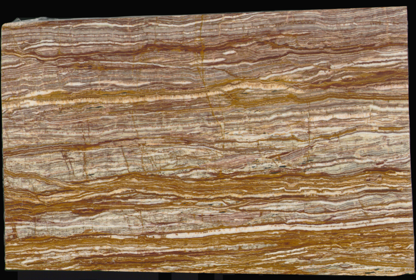 产自墨西哥,底色为金黄色,版面带有较多的细小白线,红色朵状纹理及黑色纹理,局部带有大块白色、黑色疤纹。裂纹较少,无孔洞,石质细腻,通透性强。