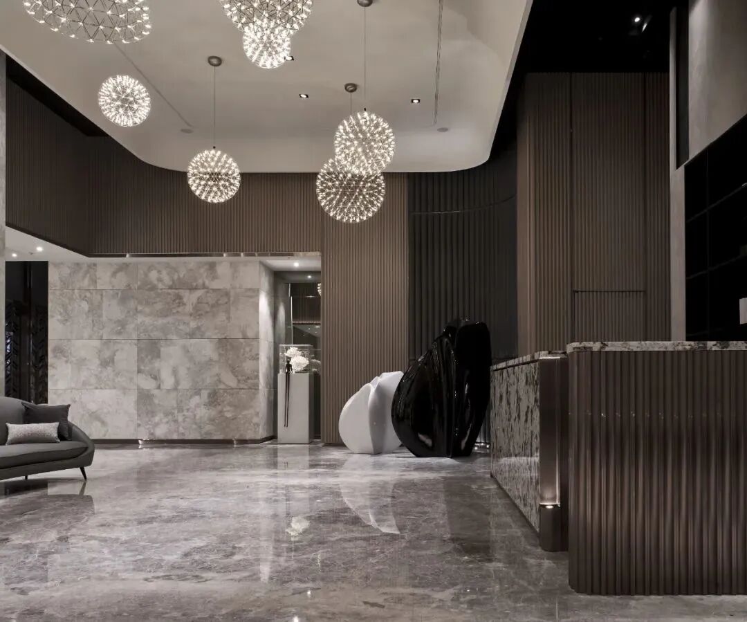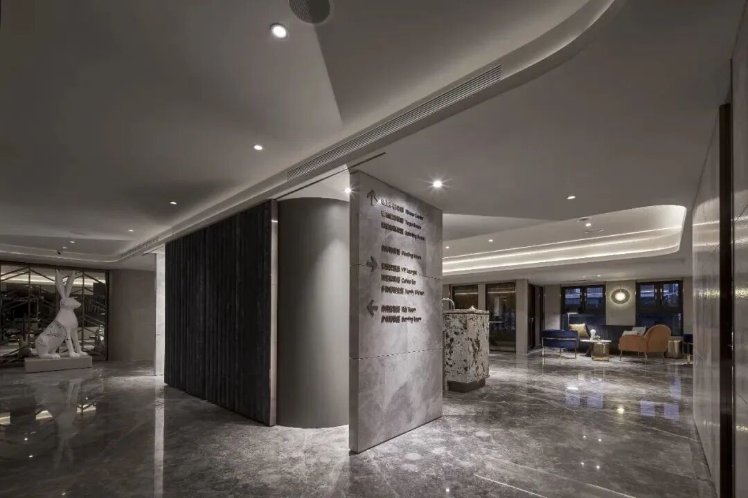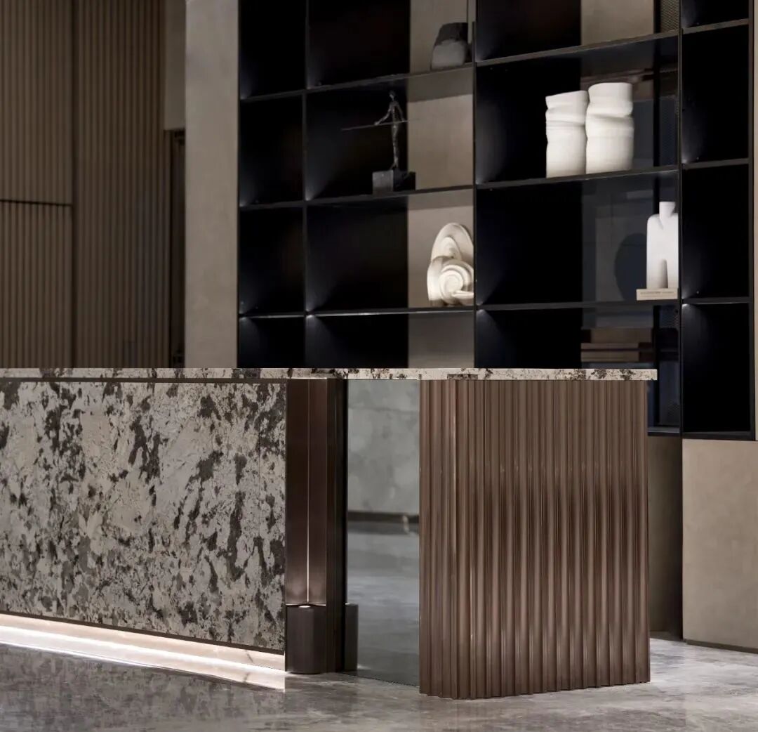 站在由大理石及镀钛金属所铸造的柜台里,视野所及综观全局,能全方位的照顾到各地出入交会于此的住户。