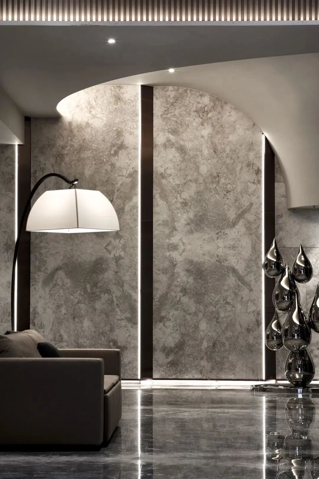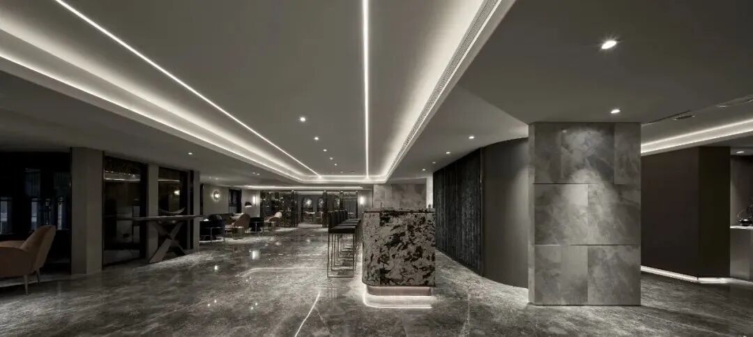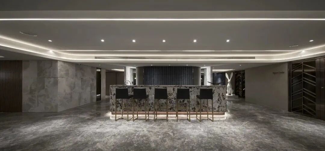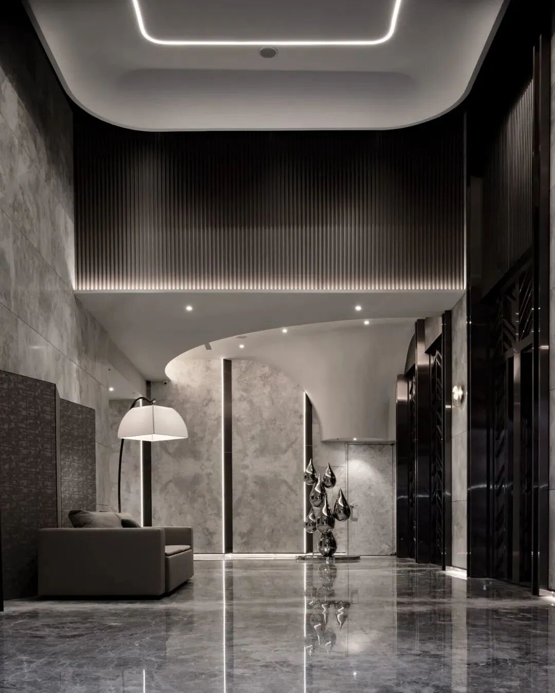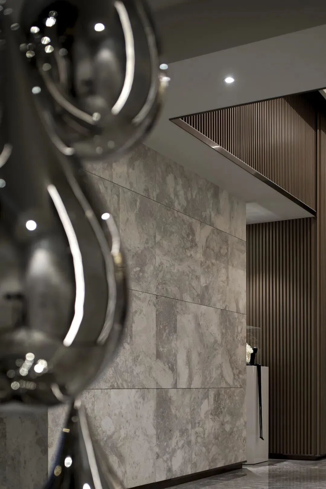 灰色沉稳内敛的石材,搭配线灯的光束,适时的留白衬托出光影折射的方向性,富有韵律的光影变化,带给住户回家的仪式感。