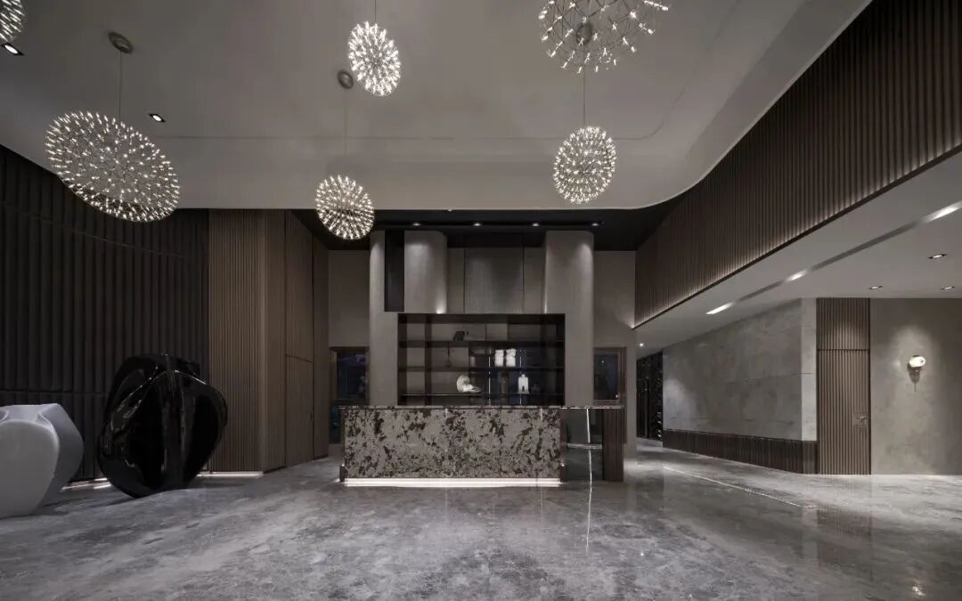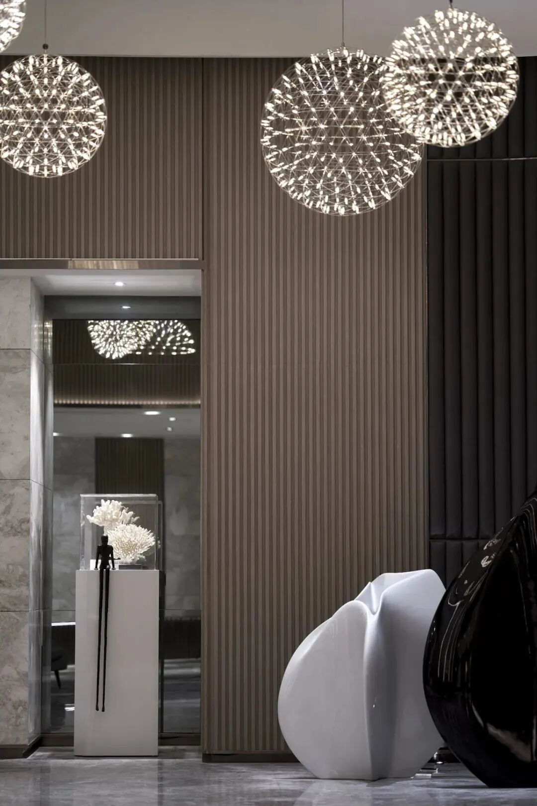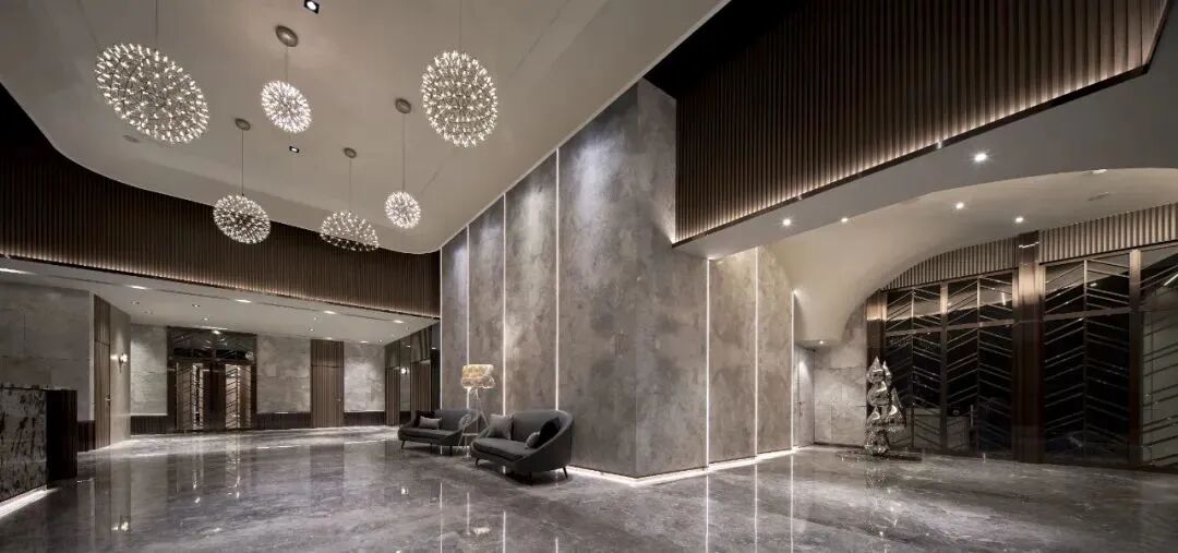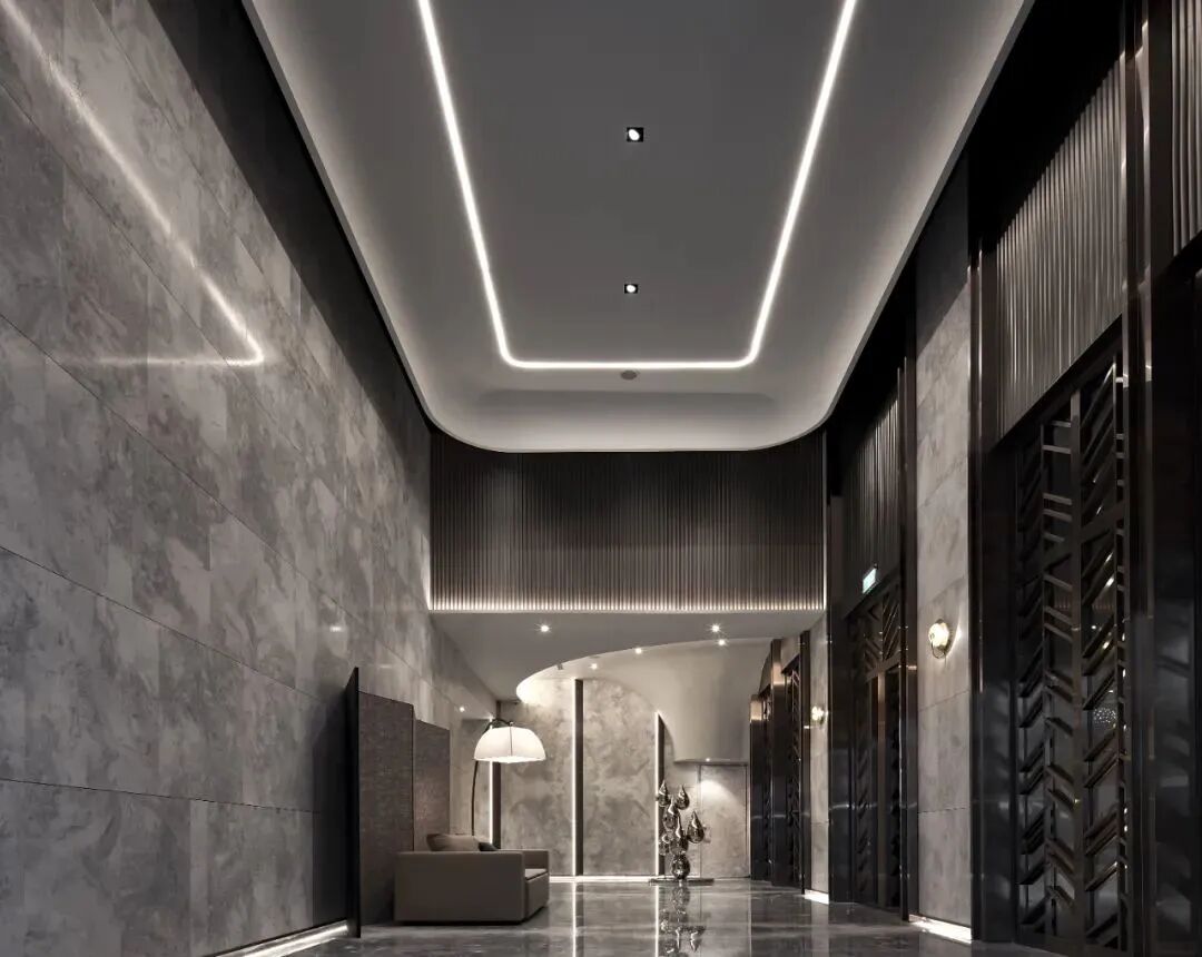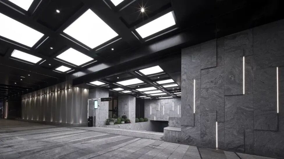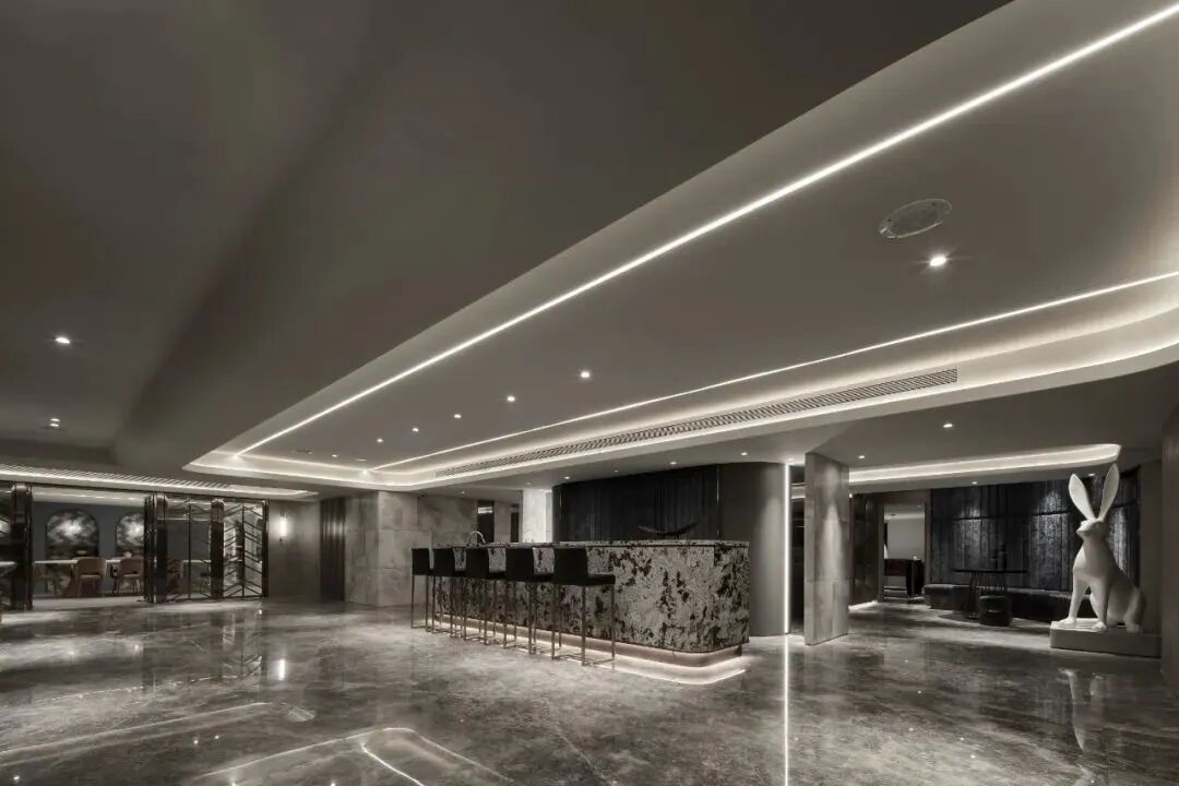 灰色沉稳内敛的石材,搭配线灯的光束,适时的留白衬托出光影折射的方向性,富有韵律的光影变化,带给住户回家的仪式感。