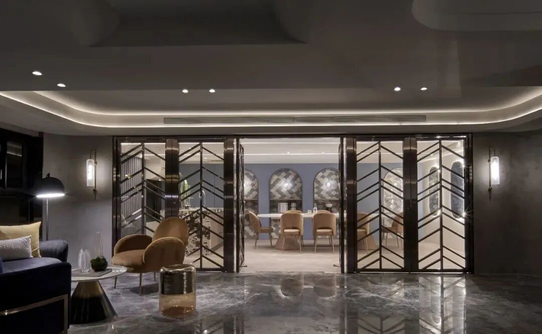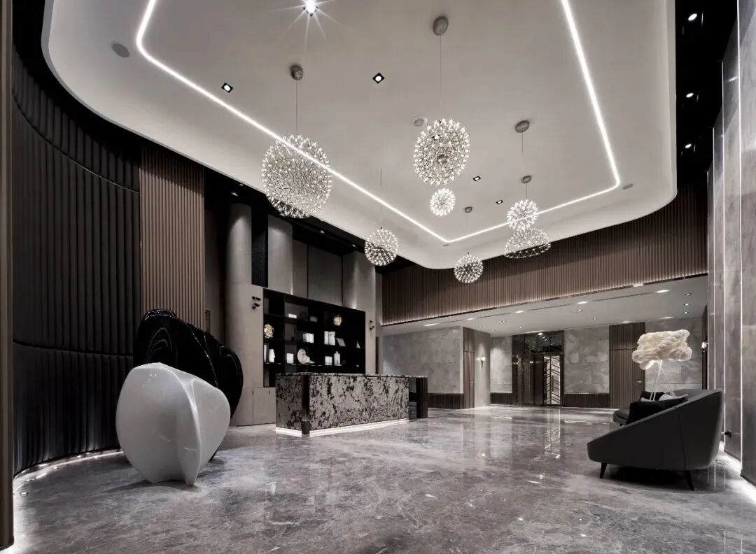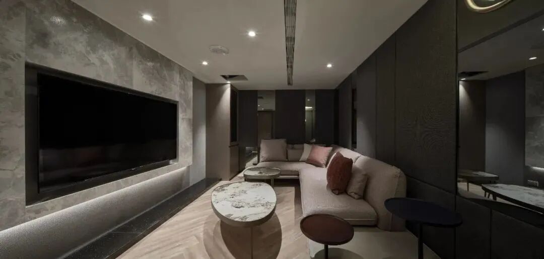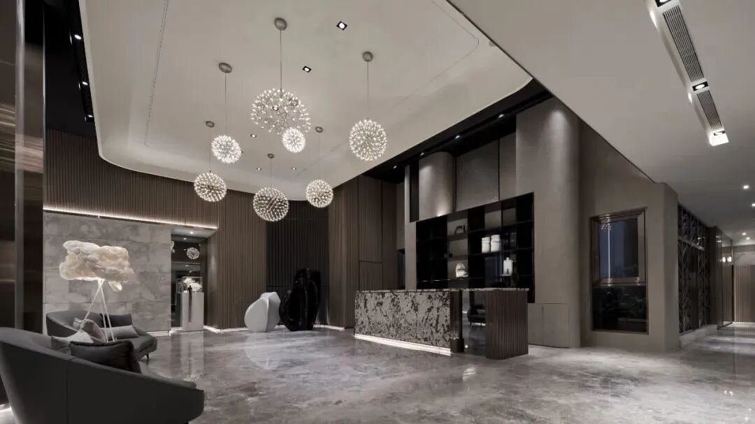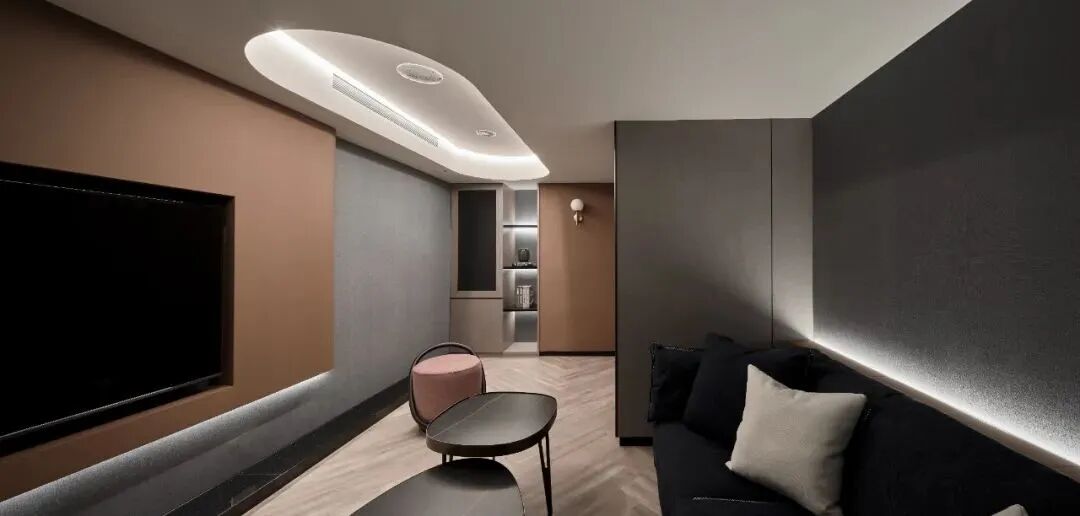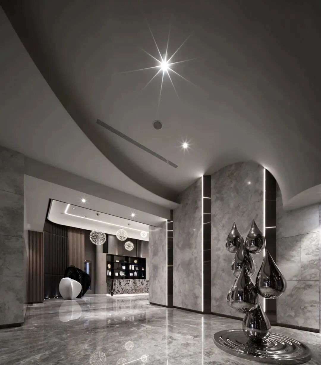 灰色沉稳内敛的石材,搭配线灯的光束,适时的留白衬托出光影折射的方向性,富有韵律的光影变化,带给住户回家的仪式感。