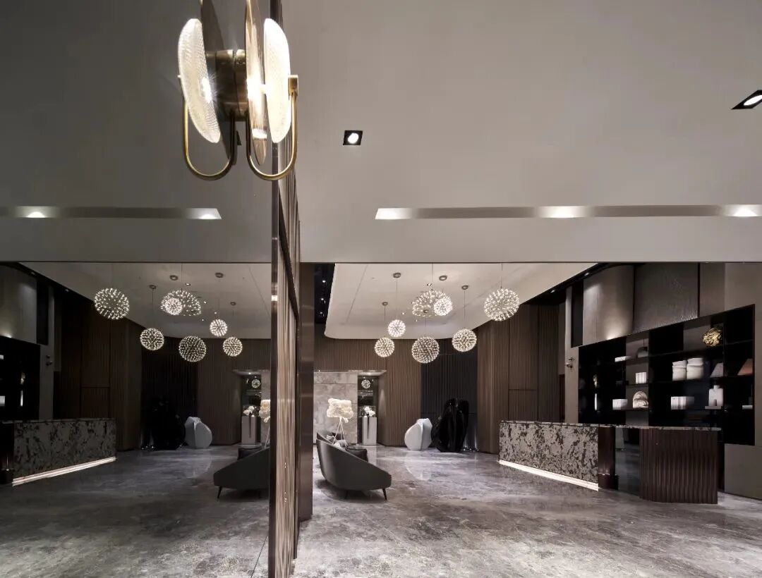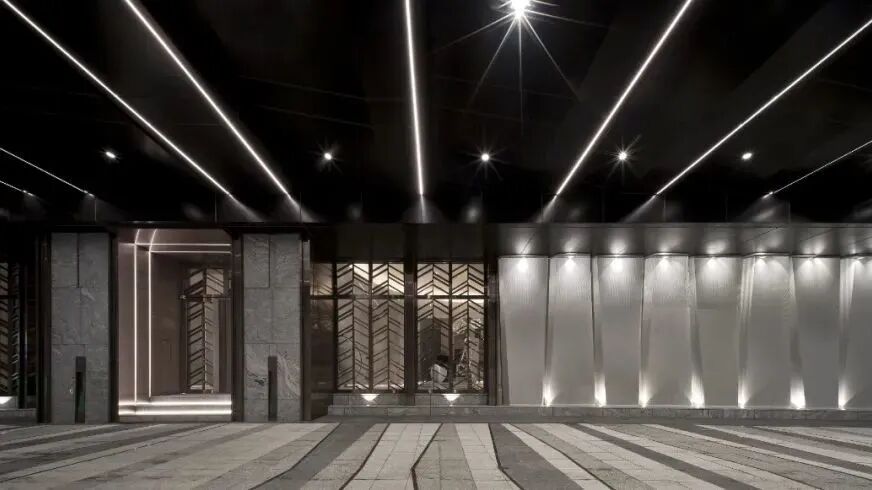 位居新北双和核心地段的太阳帝国,入口由大理石材打造。沿着迎宾车道进入,一路可见金属造型折板呈现序列光影,引导每一位来到这里的人。