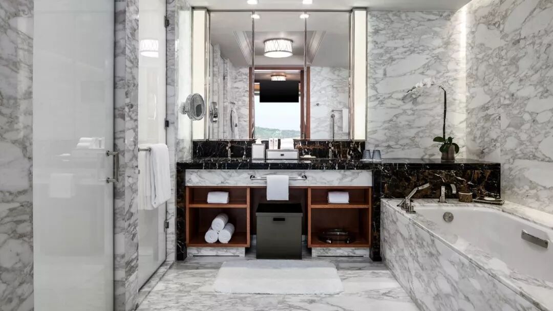 但是,因浴室具有洗浴的特定功能,水汽较多,所铺设的石材如果保养不当,极易受污染。所以,当您一旦选定某种石材装饰您的浴室,一定要事先设计好一套完整的保养方案,以确保石材长期保持天然亮丽的外观,并延长它的使用寿命。保养方案应包括将细菌和霉菌从石材表面清洗干净并消毒。与此同时,清洗剂应不会腐蚀石材的表面并能阻止霉菌的再生。