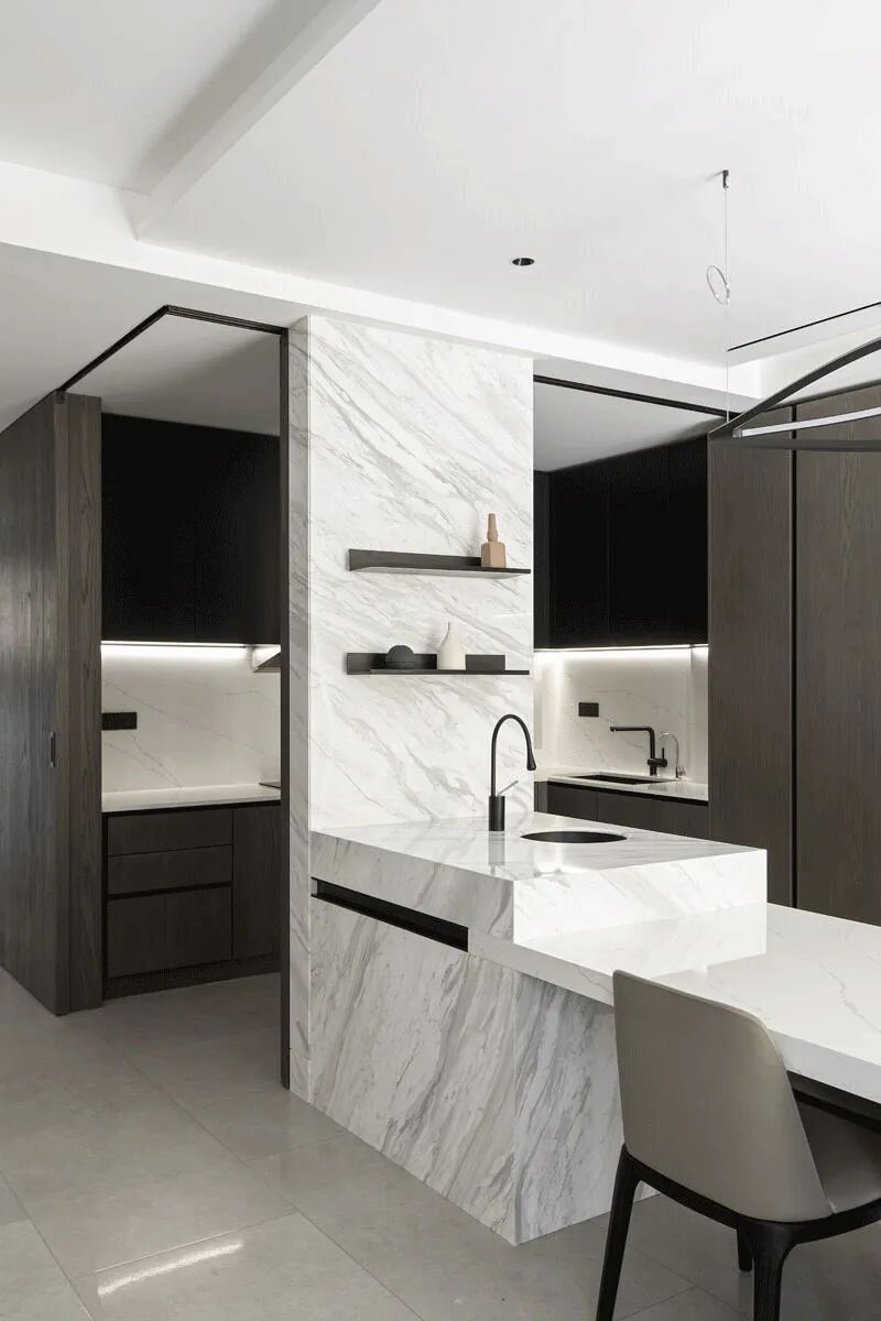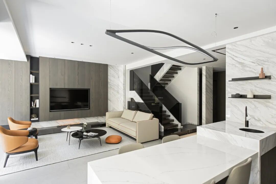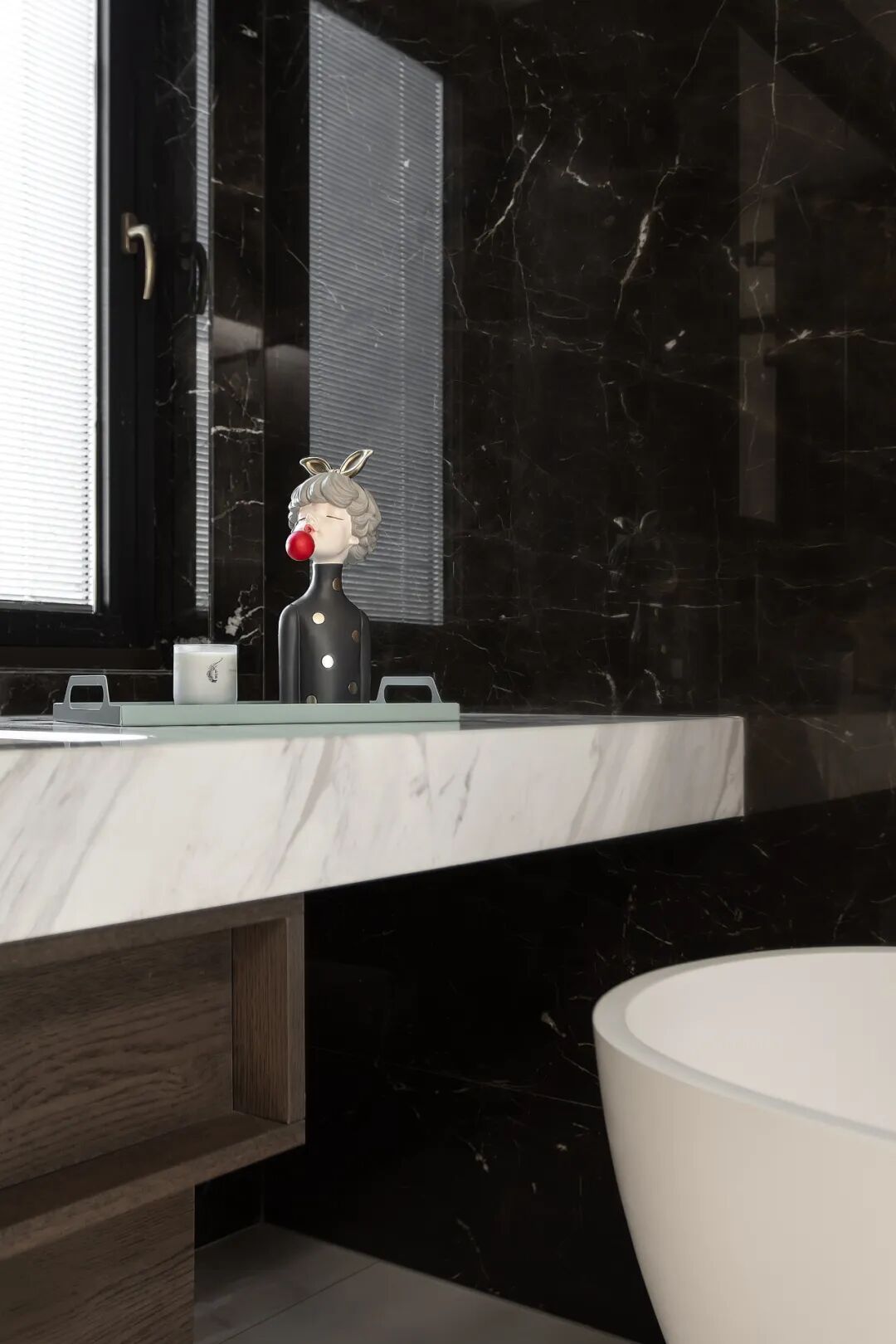 本案为一家四口的80后家庭,男女主人偏爱黑灰色糸沉稳所带来的知性美,并喜欢简洁且实用性较强的空间体验。一女一子性格活泼、求知欲强,喜欢交流并善于言表。男女主人想以此空间给予孩子们更多的陪伴。室内使用了爵士白大理石,让空间更加优雅。