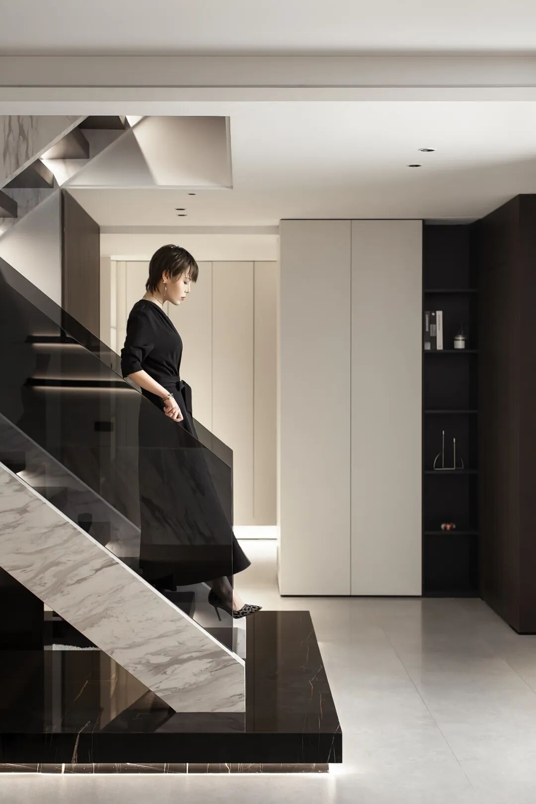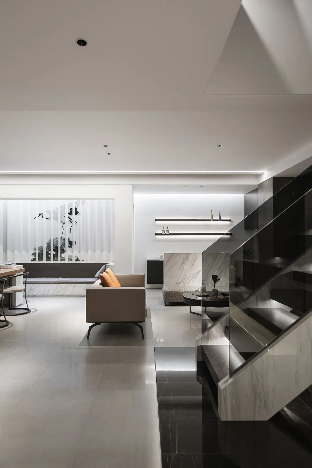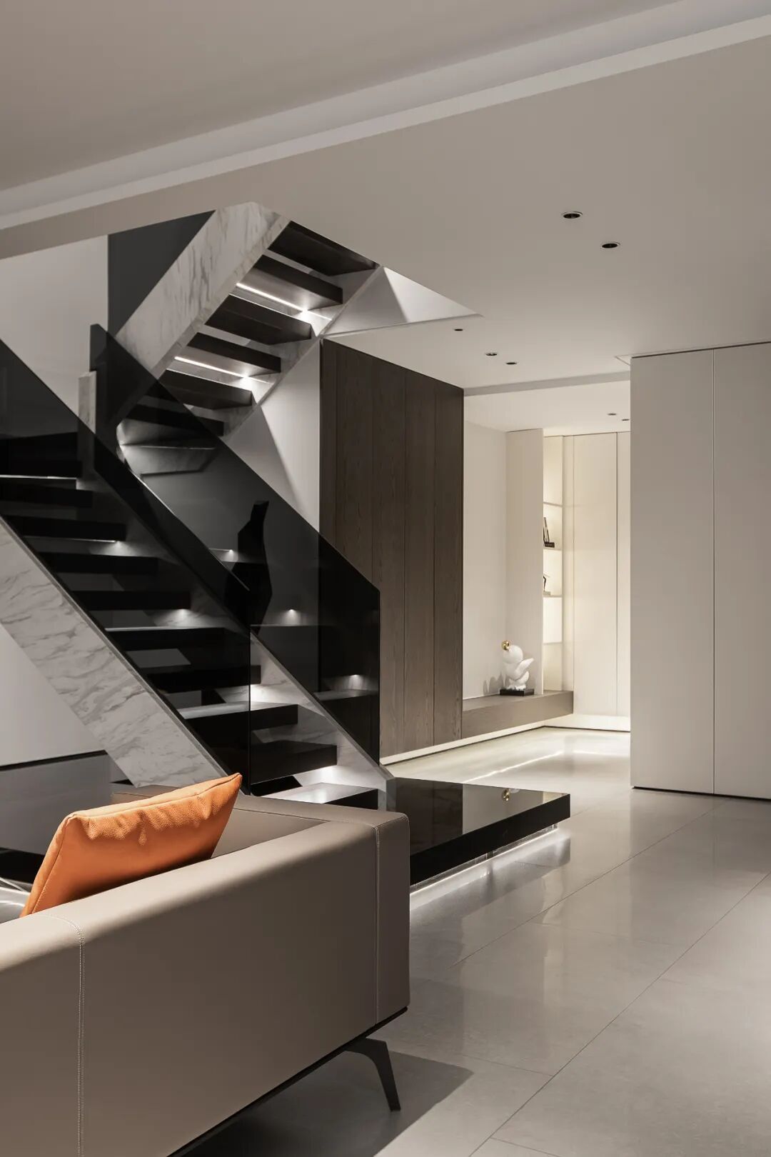 楼梯是一个空间的灵魂之美,也是贯穿二楼与地下负一层的桥梁,所以需要将它设计的再理性一点,再通透一些。灰玻扶手,悬空踏下的灯光,便以让更多的光与风可以引入负一层,穿过二楼的通道,让空间变的更轻。