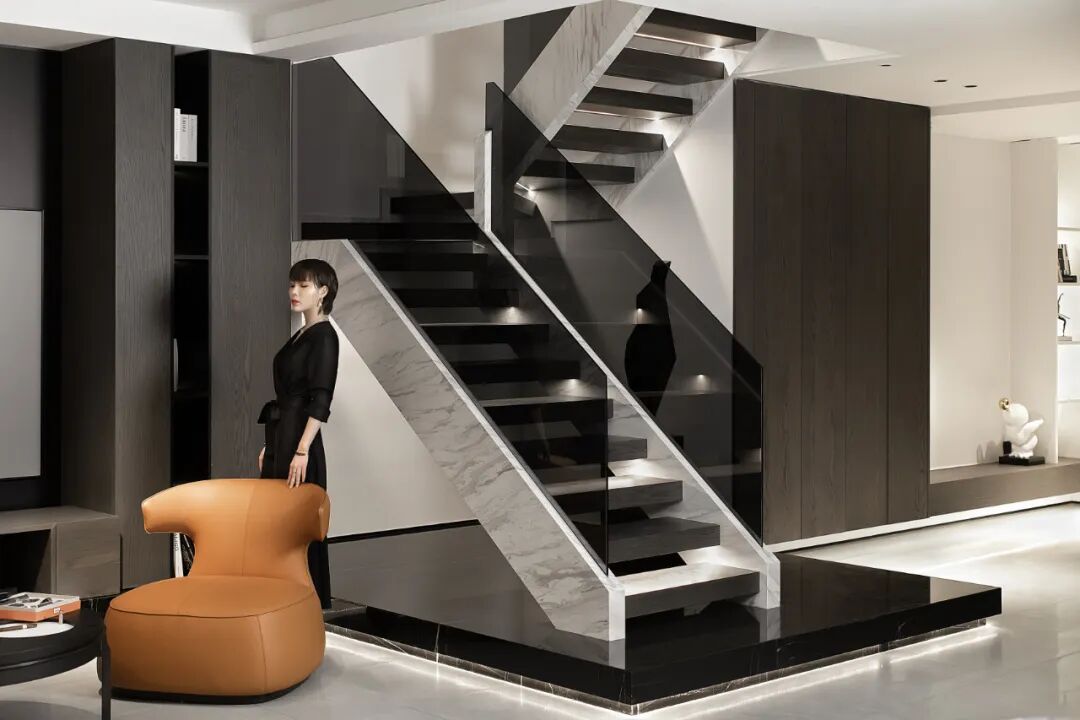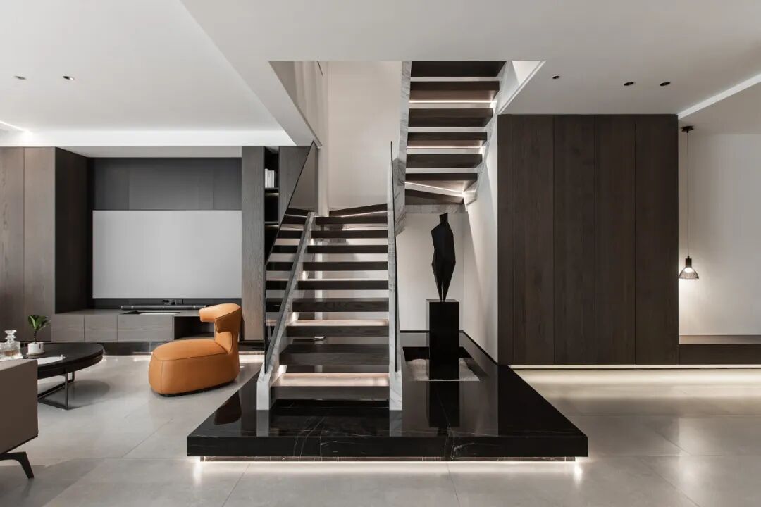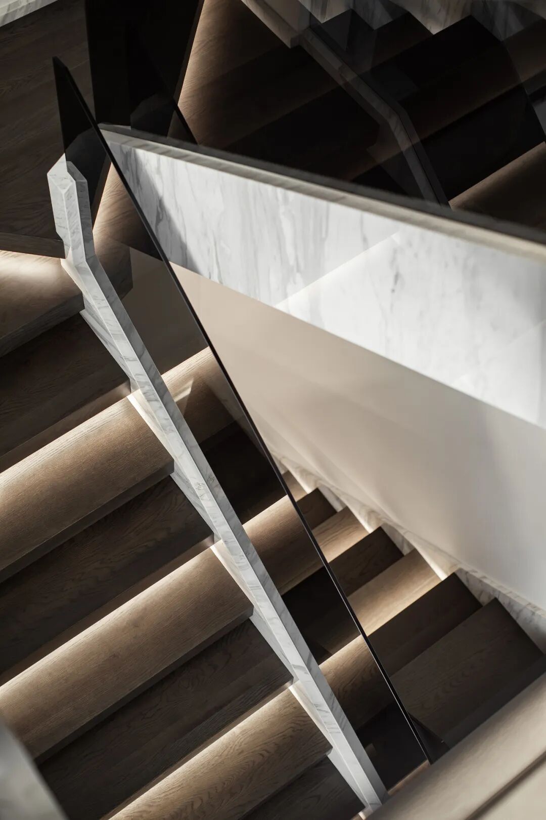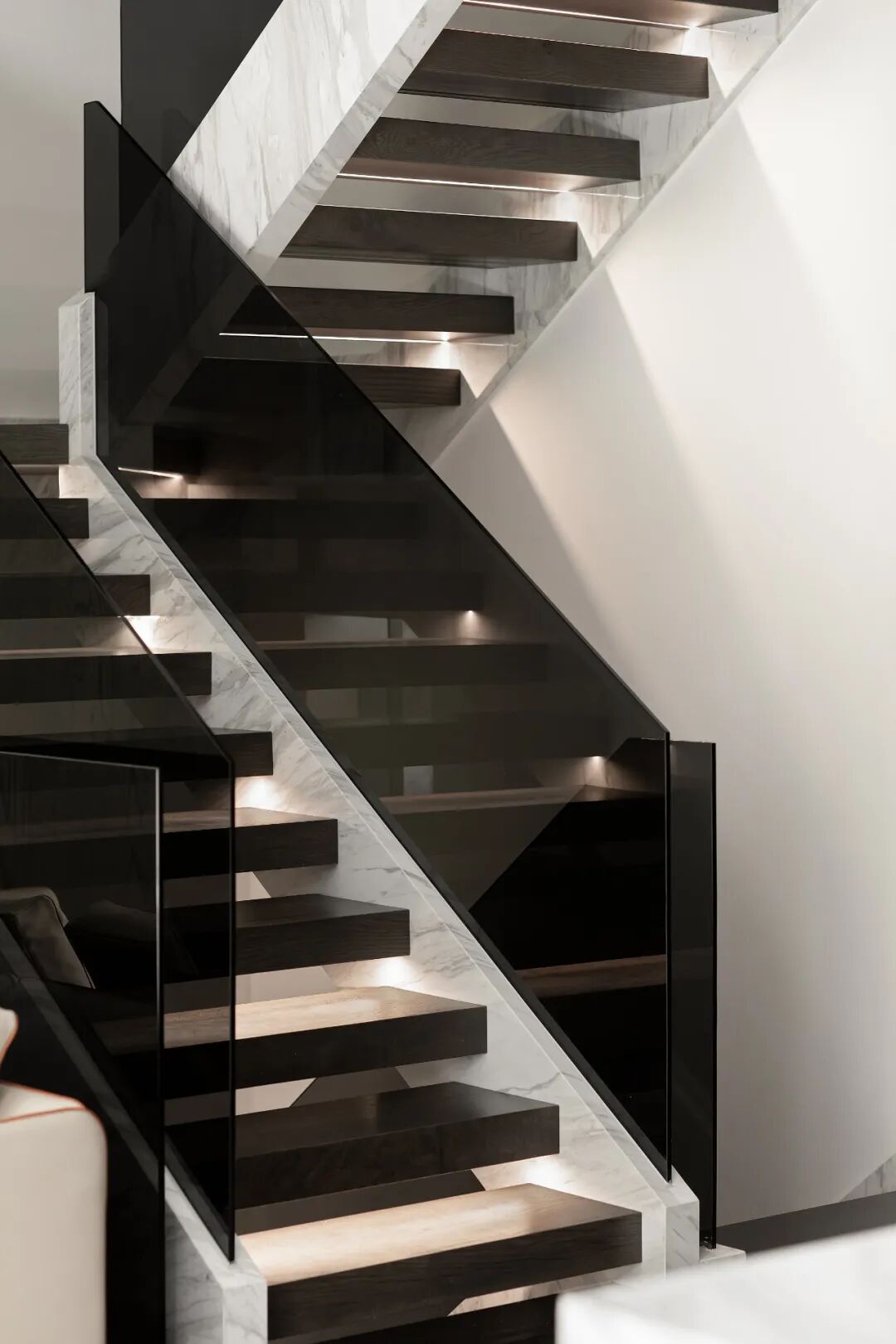 楼梯是一个空间的灵魂之美,也是贯穿二楼与地下负一层的桥梁,所以需要将它设计的再理性一点,再通透一些。灰玻扶手,悬空踏下的灯光,便以让更多的光与风可以引入负一层,穿过二楼的通道,让空间变的更轻。