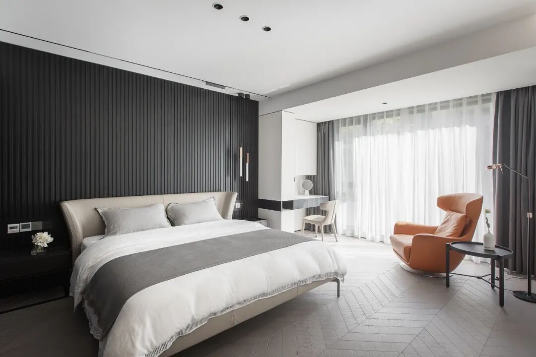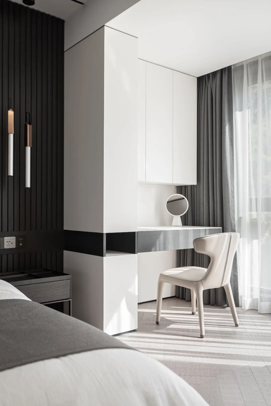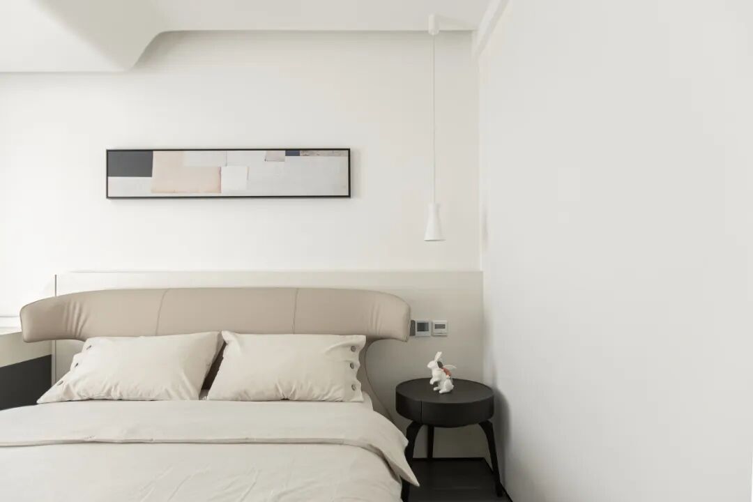 轻推主卧的门整个主卧空间的色调呈现出优雅的一致性,浅色地板温润的肌理搭配家具让现代感的曲线元素得到了很好的诠释。