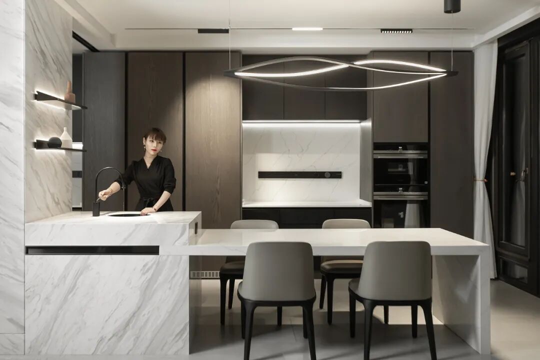 餐厨因客厅的关系显得狭小,在与主人沟通并得认可后,果断地去掉传统的餐桌,将原来中厨房扩展到餐厅,加大厨房高柜,不仅能容纳更多的电器设备也达到了收纳分类的述求。以满足当代餐厨社交文化的需求,将烹饪与就餐变成家人分享交流的空间。