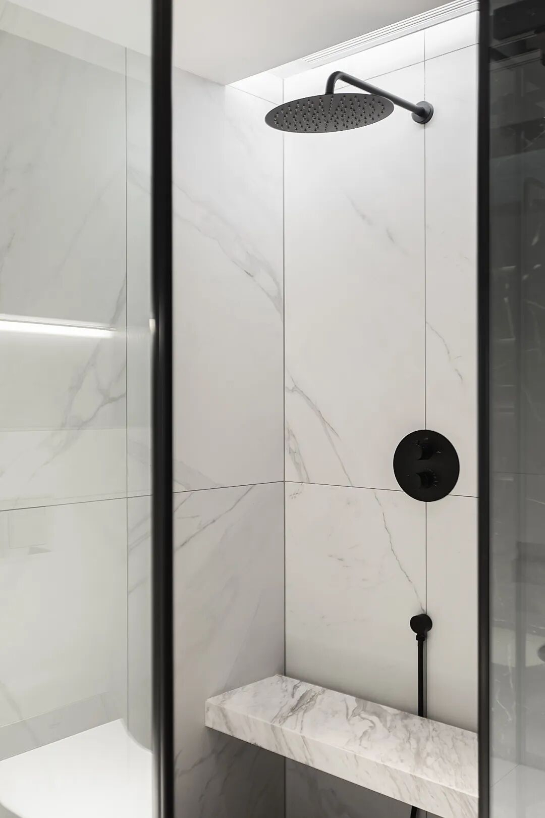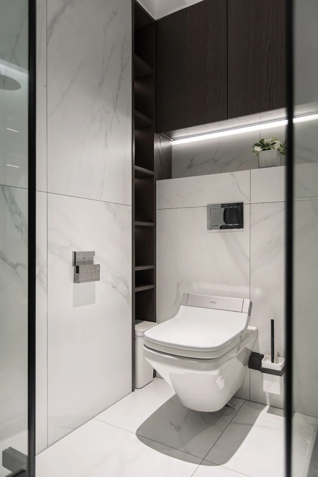 喜欢独立如厕室与淋浴,即使是夫妻也需要一定的私密感。将如厕柜设计成小格式,每一处都可收纳所需,淋浴座櫈可以更安全舒适的冲凉。