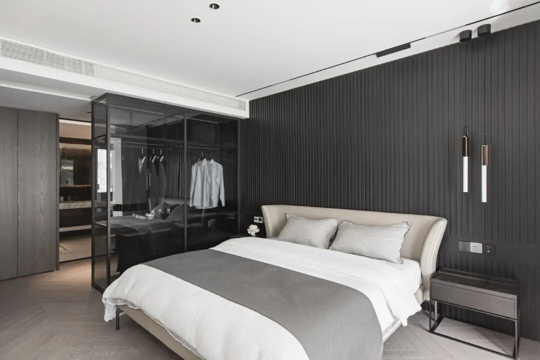 通过试衣帽间,原本就不太富裕的尺寸,在中间设计了一个通透的玻璃衣柜解决了采光,又释放了衣帽间与卧室的空间。