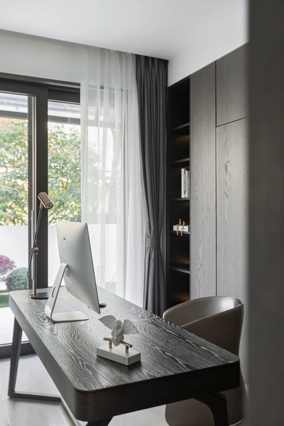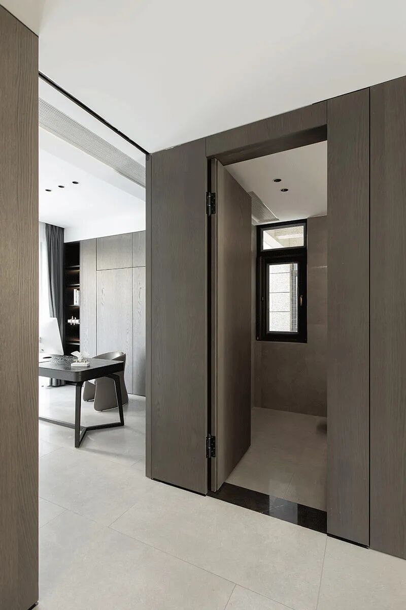 为进一步的释放一楼公共区域,我们选择摒弃了传统客房,将书房门与外卫门做隐藏式处理,当书房的移门拉出时,便隔绝了公区与书房、客房的私密需求;喜欢宽敞,不喜欢太多的门,所以连外卫的门也一起消失做成隐形门。符合我们一惯的简洁理念,任何功能性物件当需要之时出现,不需要时隐藏,让空间穿行更自由。