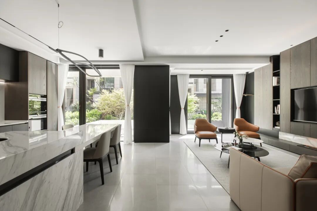 于是便将空间公区以全开放的方式设计,可开合的中西厨隔断、书房兼客房的隐藏大移门,用一切可以自由的方式来模糊空间界限,让更多的光与景引入室内。