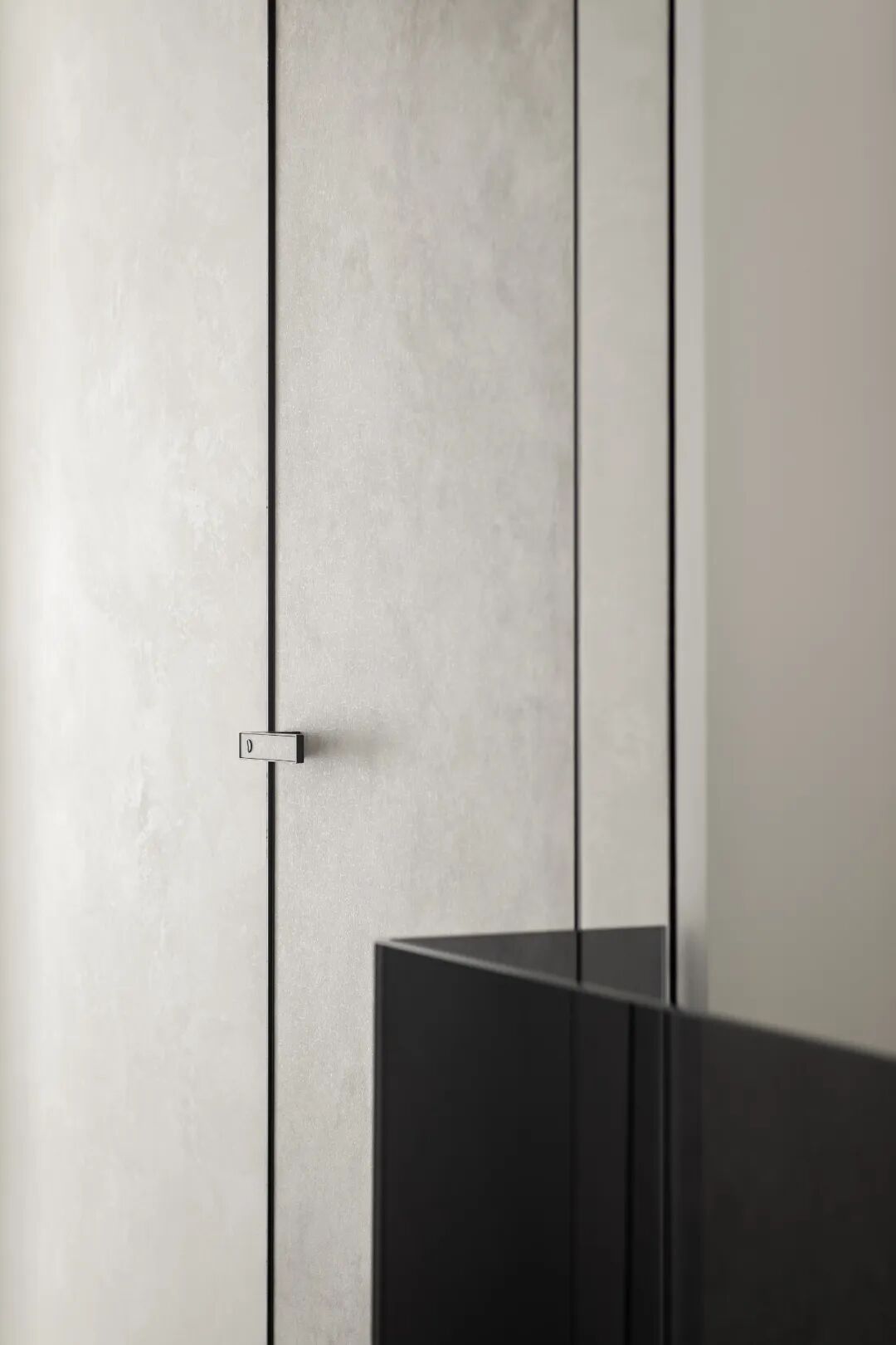 扶梯而上,为了让二层的通道变的更简单点,把三房一卫的门与墙体融合一体,极简门的质感与墙体的艺术漆一起订制,让空间更通透更干净。
