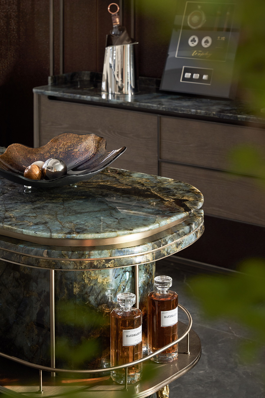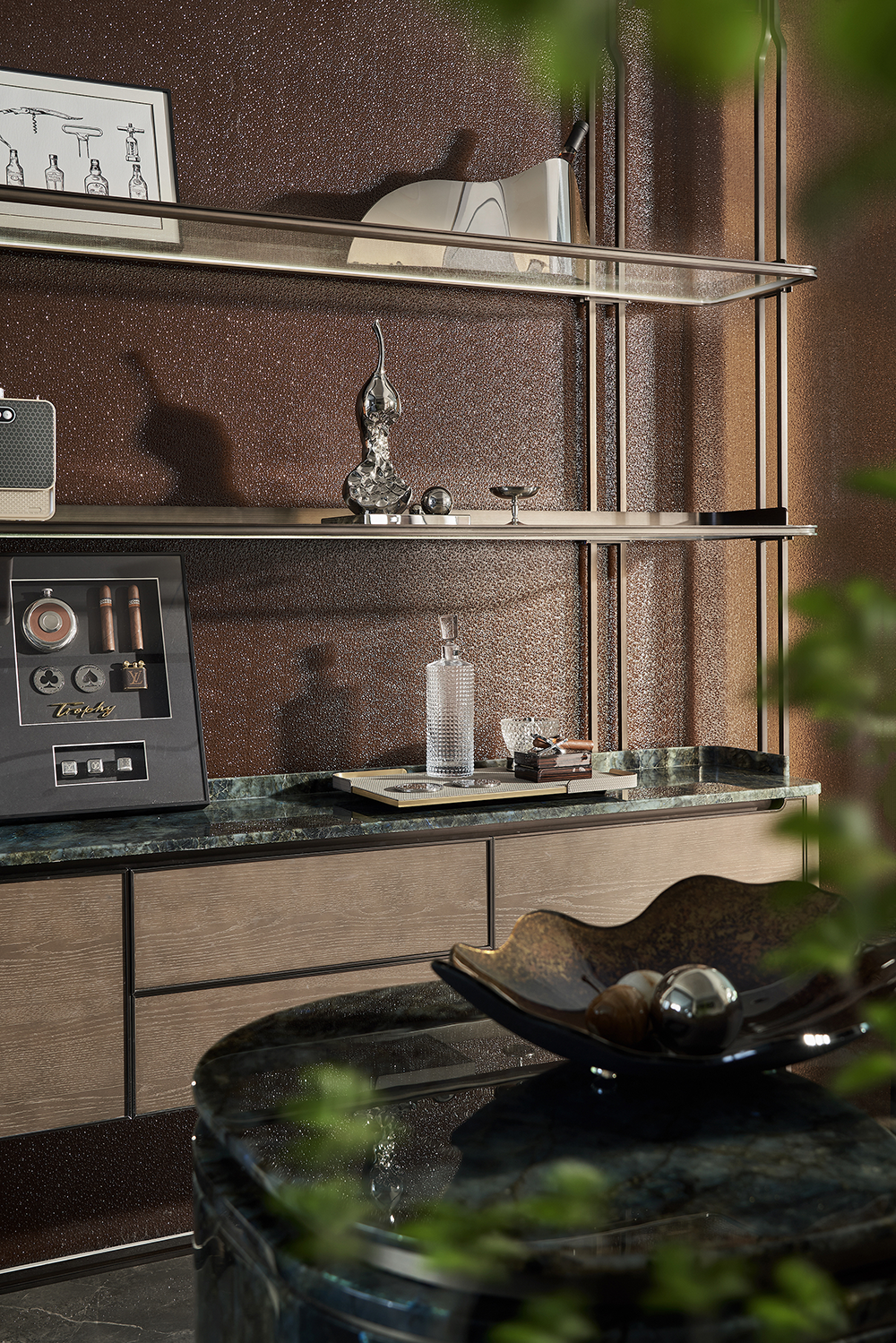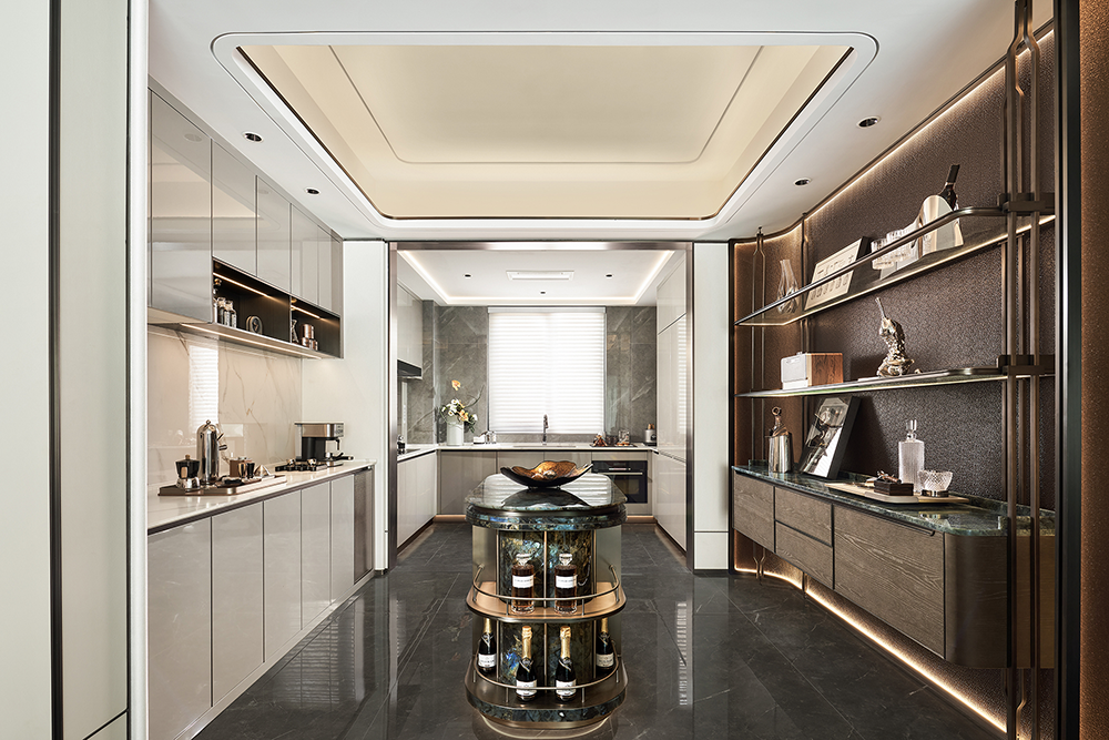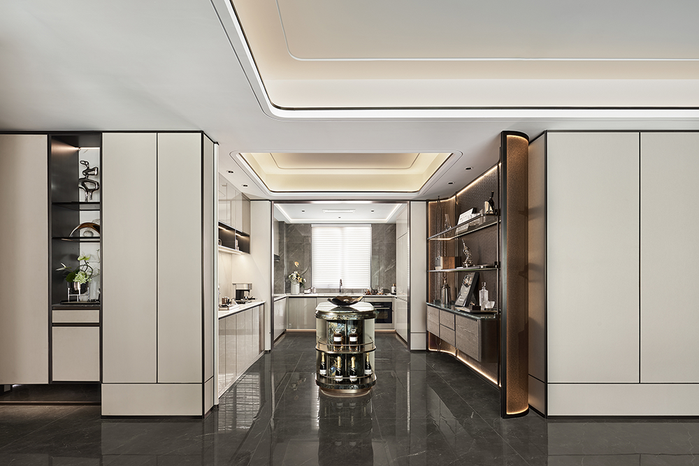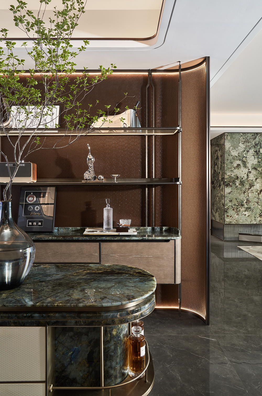 轻松惬意的待客场域,可移步岛台。这里连接着精神与物质的需求,餐前小酌一杯,观赏藏品、高谈阔论皆可满足。创新性的融入存储、展示功能,并在石材、金属、与木的碰撞中,让丰富的材质纹理与空间尺度,不动声色的增添雅奢格调。