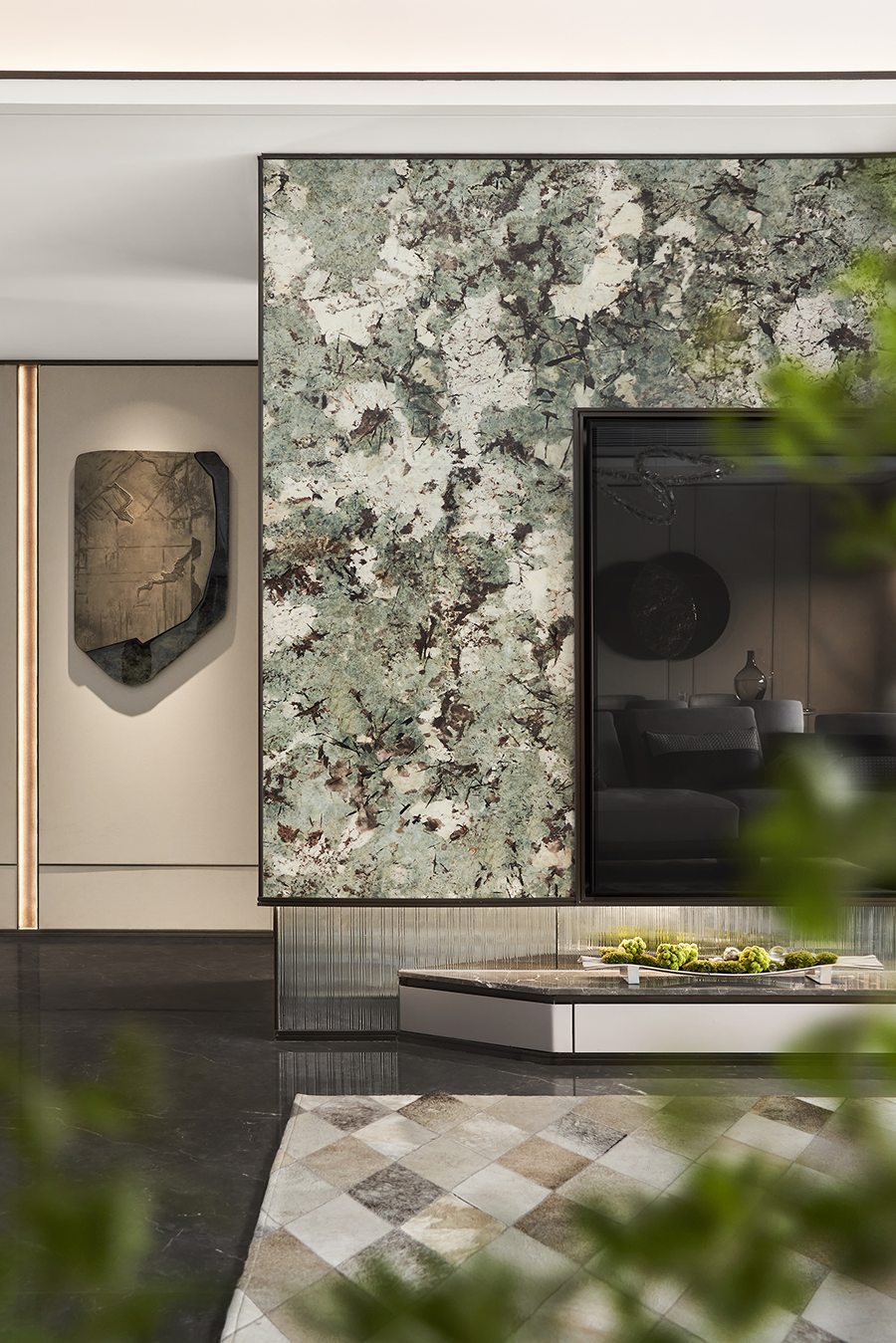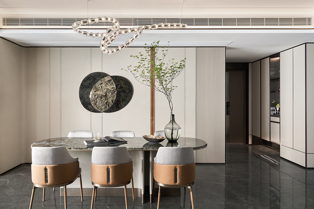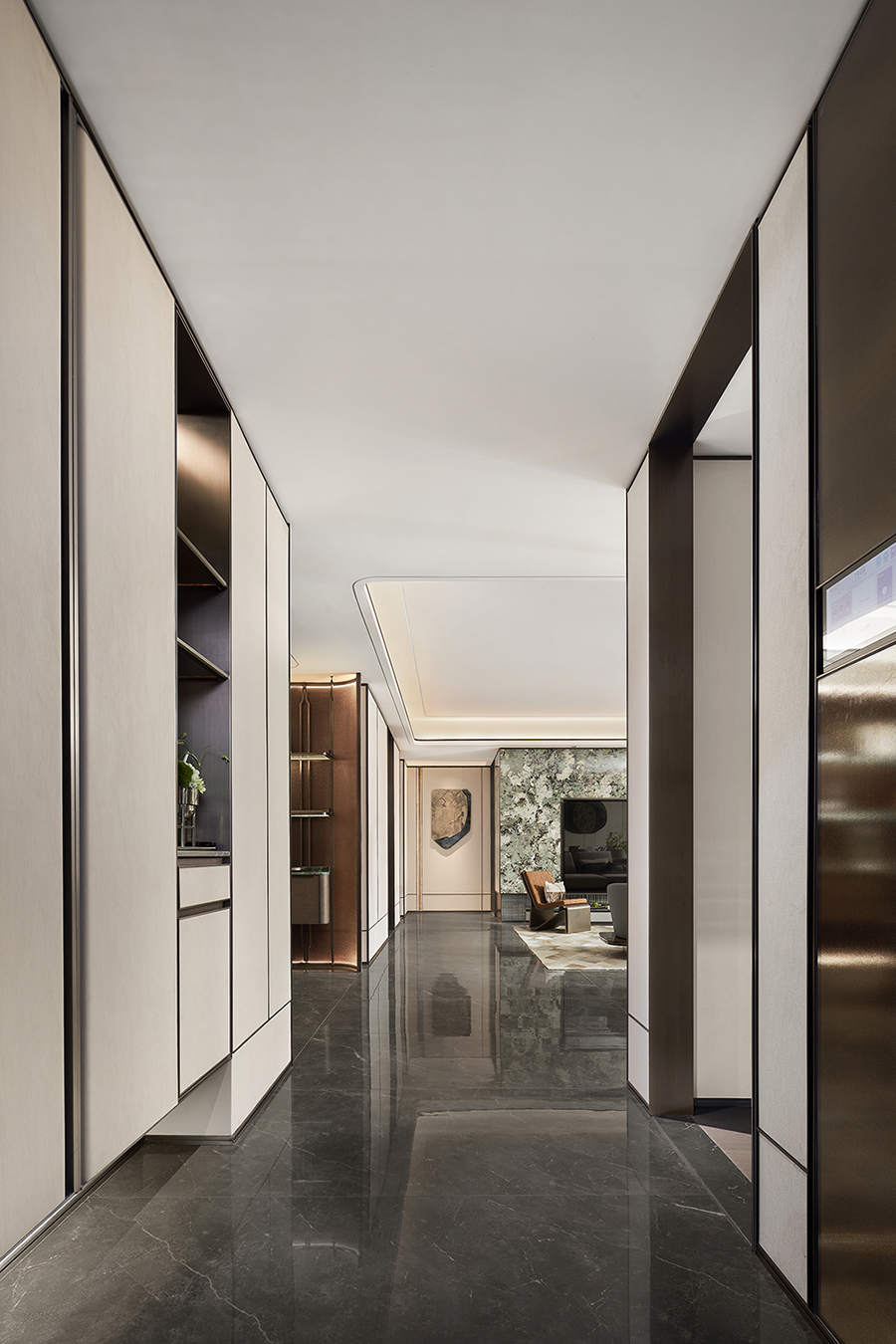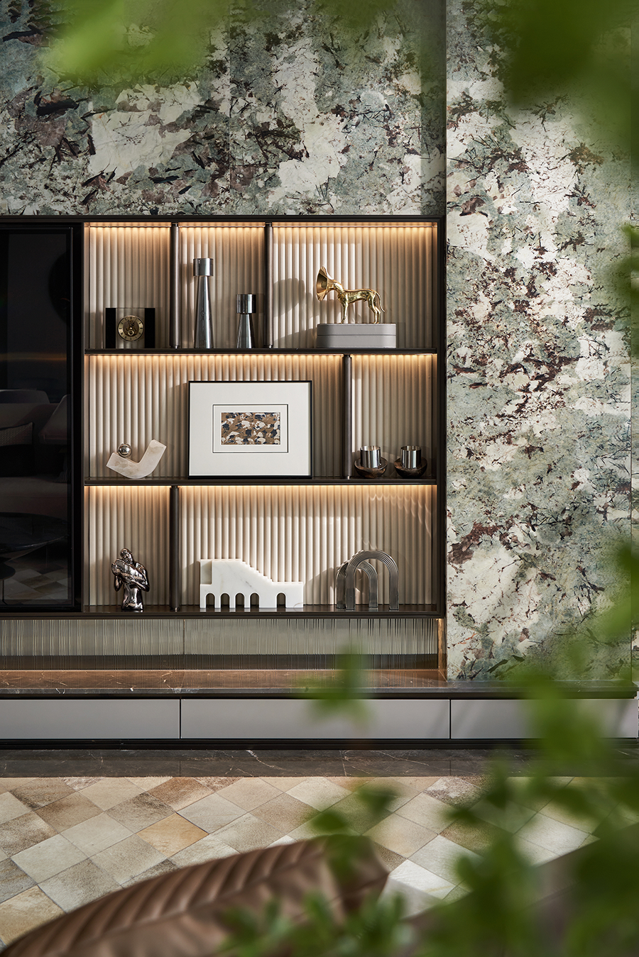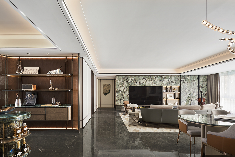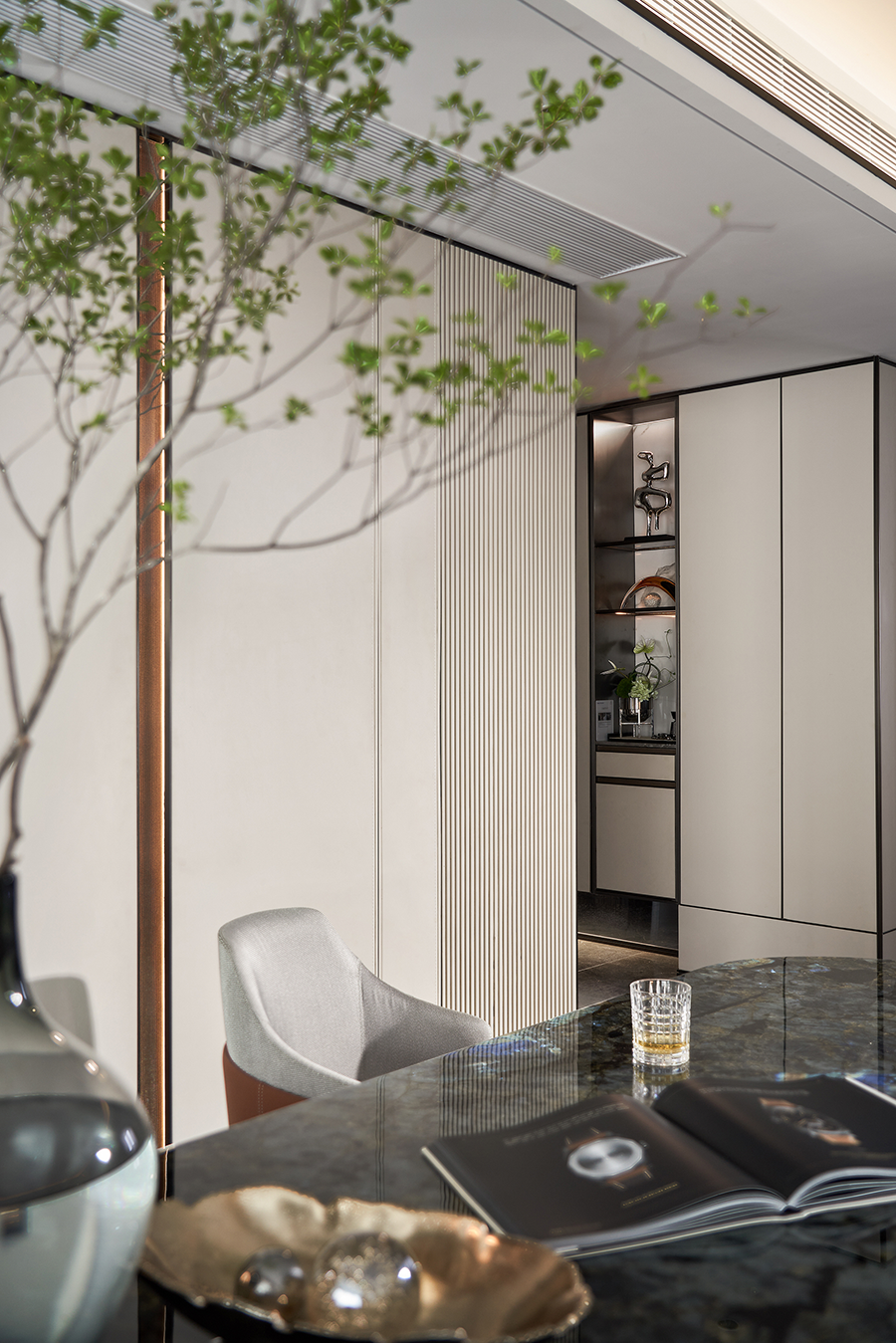轻松惬意的待客场域,可移步岛台。这里连接着精神与物质的需求,餐前小酌一杯,观赏藏品、高谈阔论皆可满足。创新性的融入存储、展示功能,并在石材、金属、与木的碰撞中,让丰富的材质纹理与空间尺度,不动声色的增添雅奢格调。