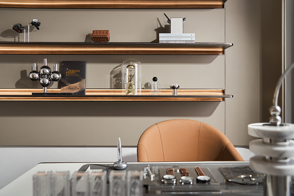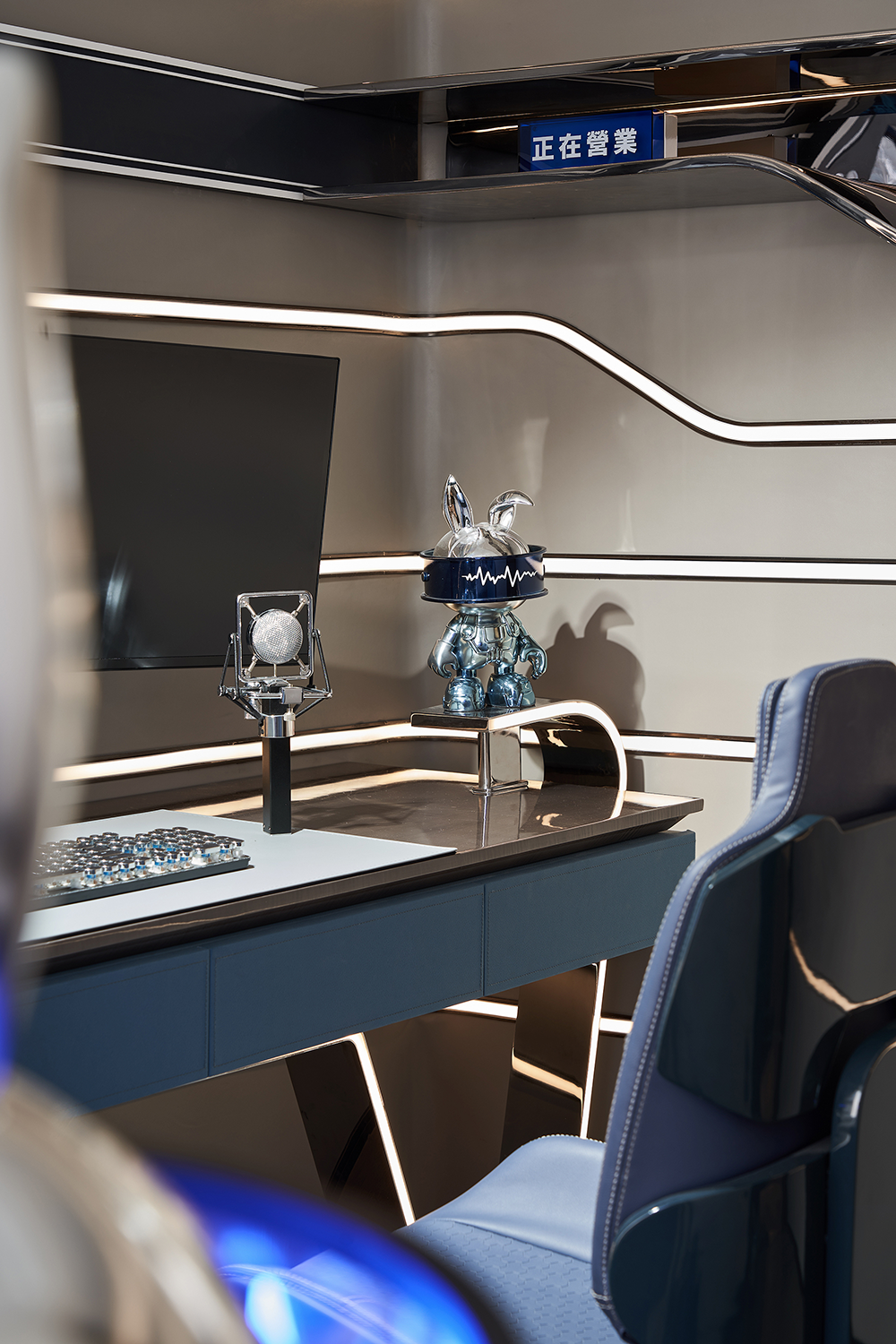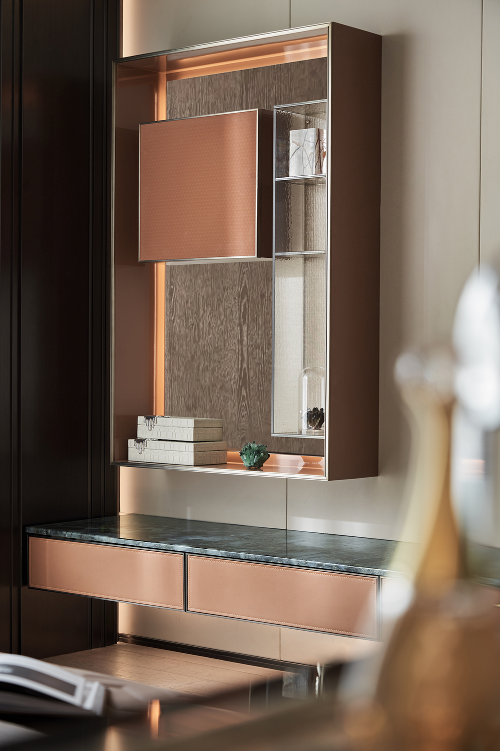 柔软的皮革、硬朗的金属,奠定了时尚雅奢的基调,金棕色搭配极具观赏性的台面,以及灯光点缀下的蓝翡翠,无形中赋予休息区别样的魅力。