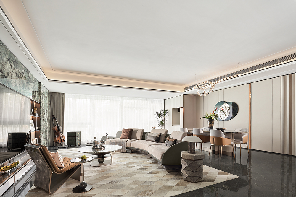 开放式格局承载着多元的层次和质感,客厅从前沿的视角出发,在律动的弧线、丰富的纹理、鲜明的色彩。
