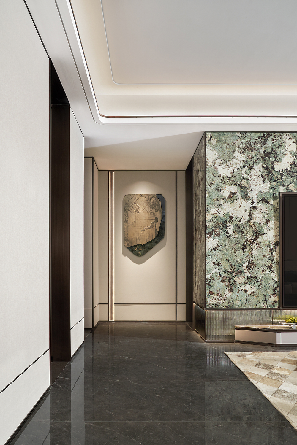 浅色背景嵌入黑色石材勾边,巧妙的壁灯则是点睛之笔,于沉稳之中带来别开生面的趣味性。