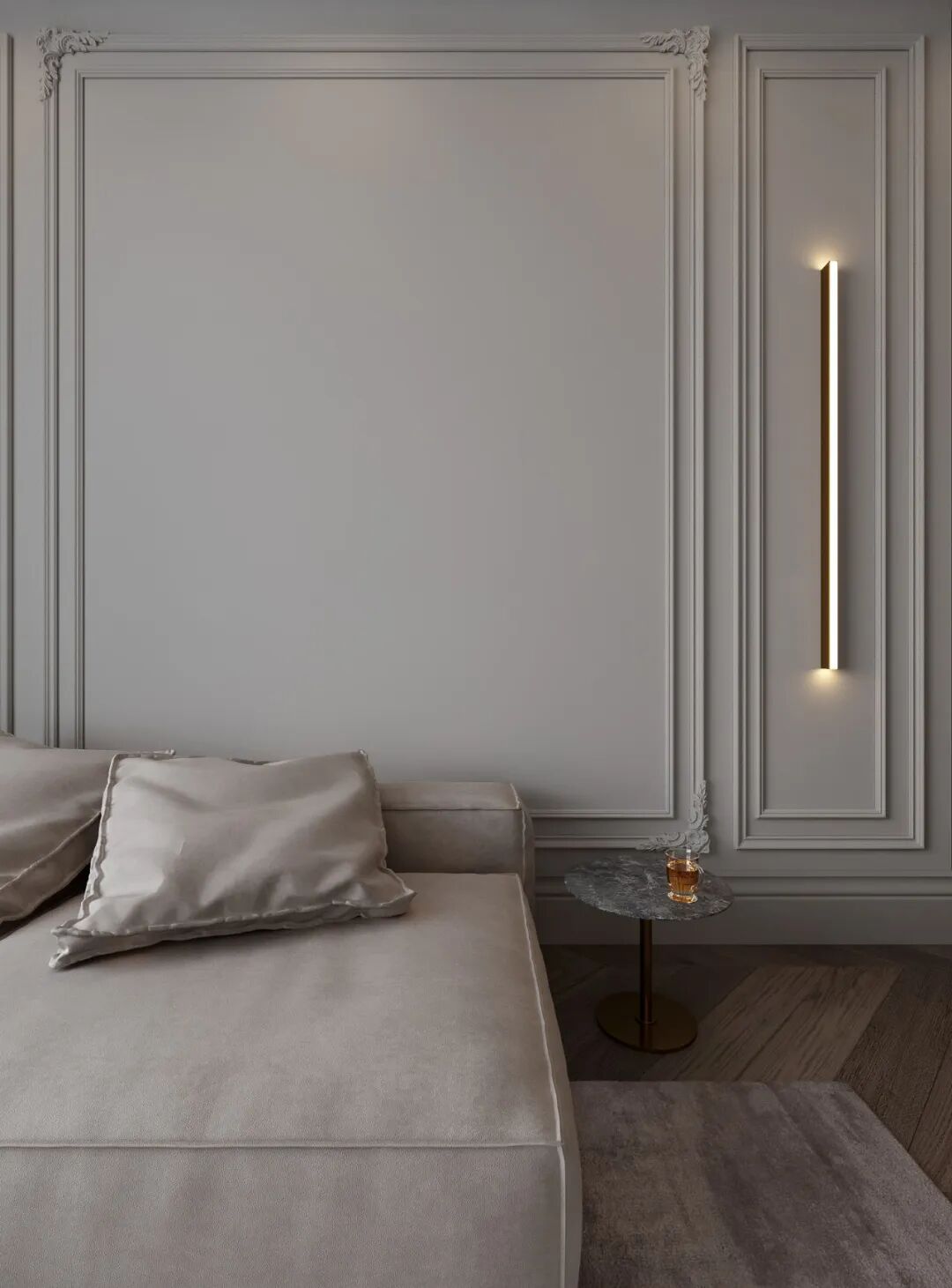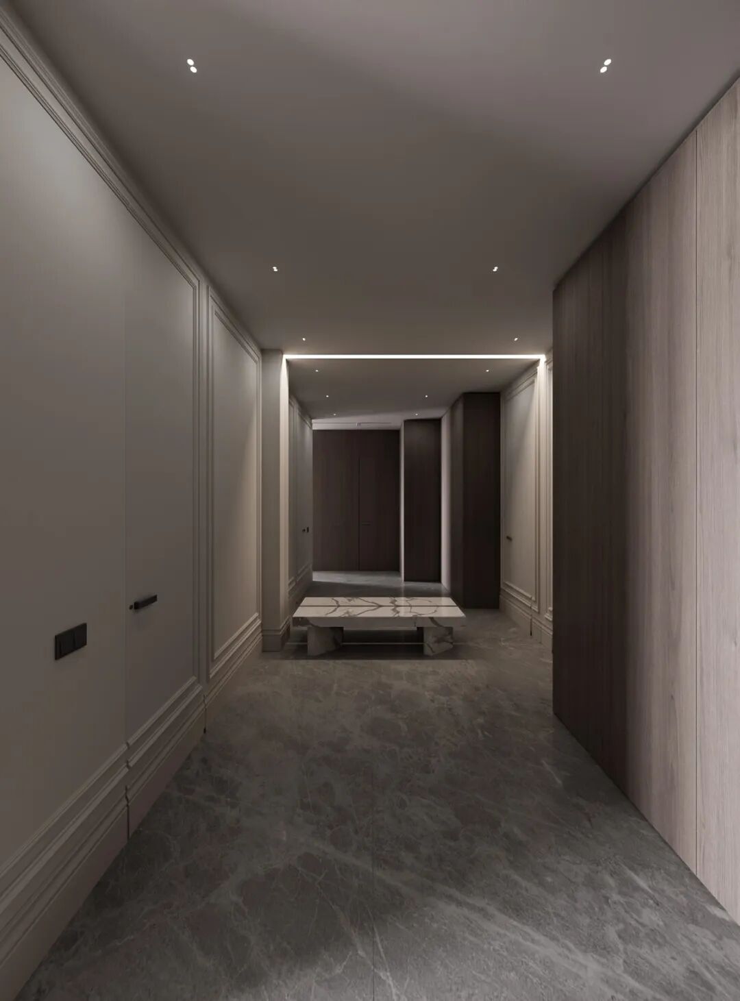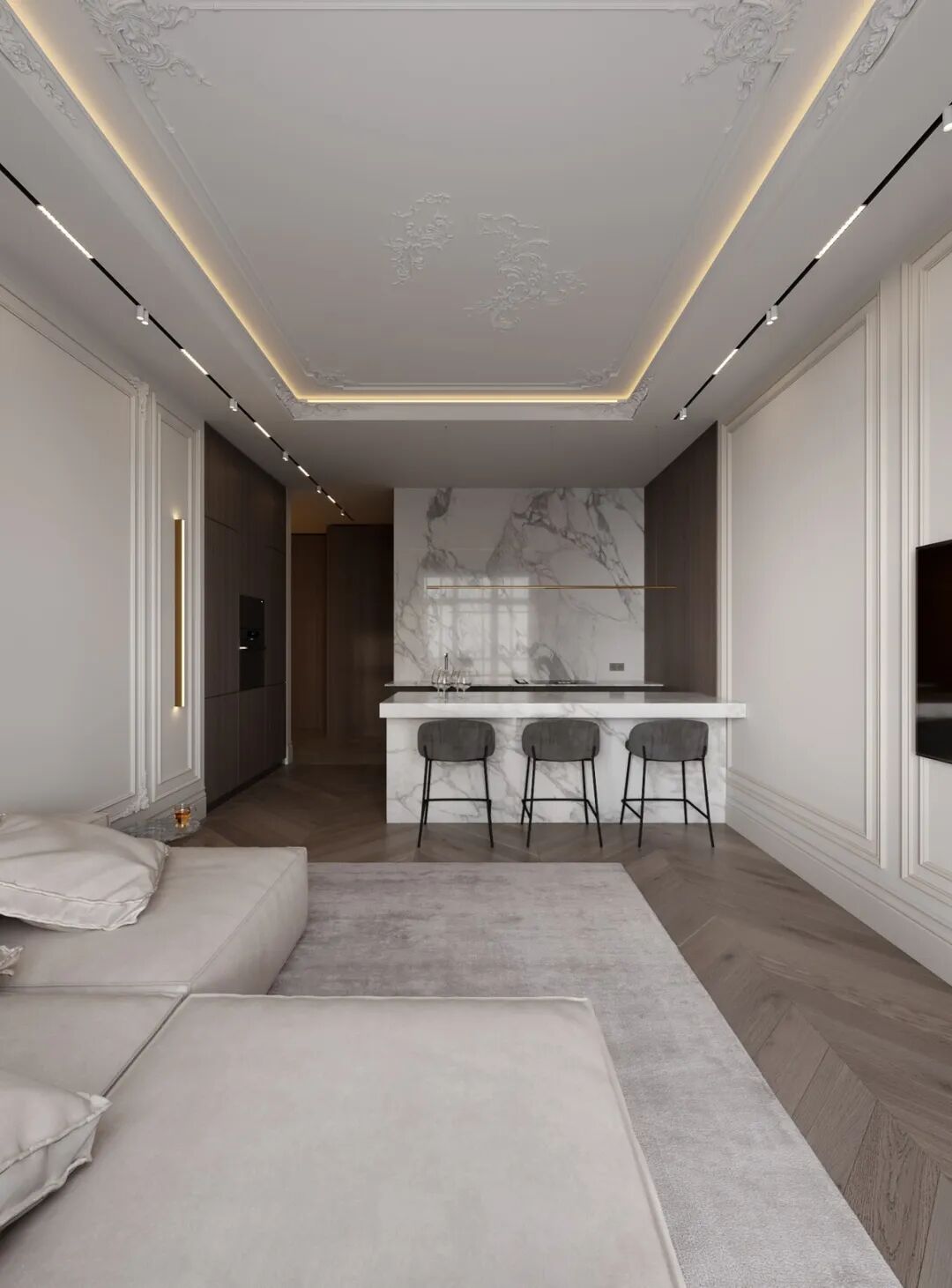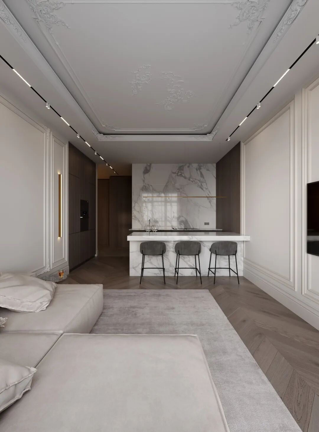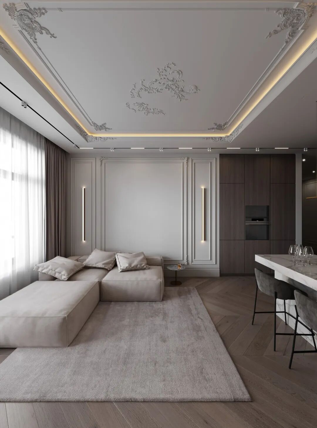 Konstantin Kildinov新作,在一个拥有自己历史和不同寻常的建筑公寓项目中,材料的选择、纹理的组合、颜色的搭配,透射出经典的魅力。没有简约的单调和随意,通过灯光的装饰设计而更突出“奢华”感,选用高档材料,奢侈饰品,强调功能实用装饰。