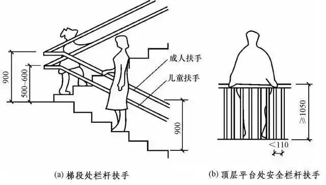 一般建筑物楼梯扶手高度为900mm;平台上水平扶手长度超过500mm时,其高度不应小于1050mm;幼托建筑的扶手高度不能降低,可增加一道500~600mm高的儿童扶手。