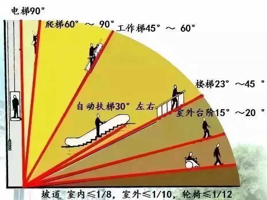 角度法:一般楼梯的坡度在23°~45°之间,30°为适宜坡度。坡度小于20°时,采用坡道;坡度超过45°时,则采用爬梯。