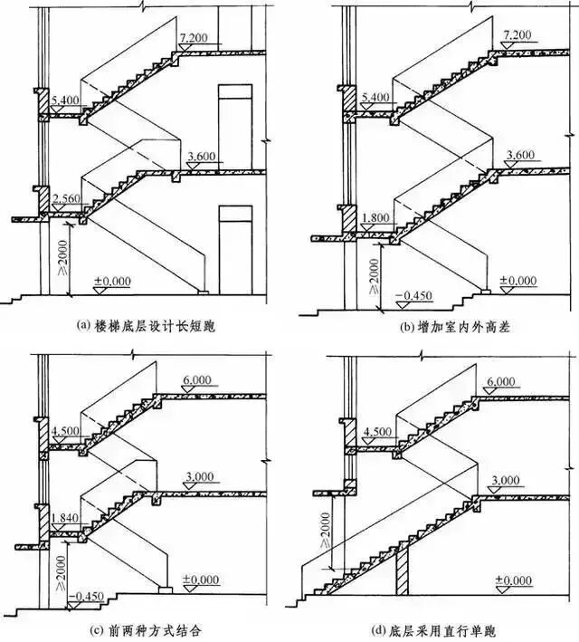 当楼梯底层中间平台下设置通道时,为满足平台下方空间净高≥2000mm,常采取右侧几种处理方法: