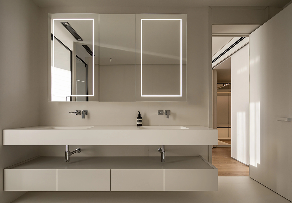 卫浴间在白色瓷砖基础上,点缀镀铬金属五金,营造洁净舒缓的氛围感。墙面开放式收纳,消化了盥洗区所有的置物需求。