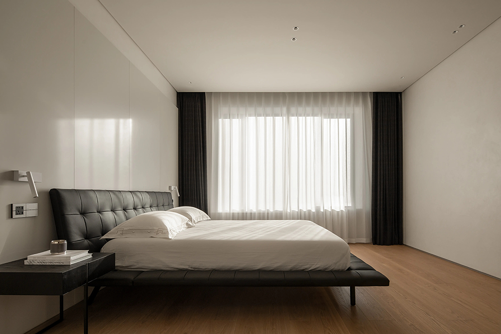主卧延续了公共区域的暖白主色调,缩小几何形式体量,适当增加了深色出现的频率,营造舒适温馨的视觉平衡。