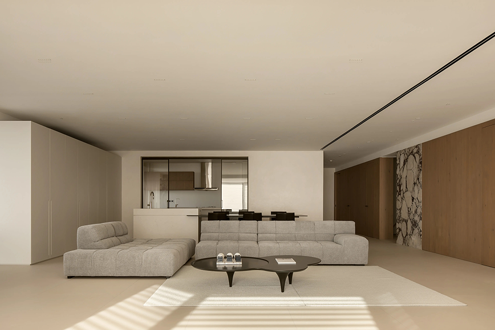 自然光浸入空间,随着时间的推移,光线在墙面、沙发和地毯上投射出柔和的几何图案,仿佛一场安静而微妙的时光印记,这是“光线一天中在一个家里行走的方式”