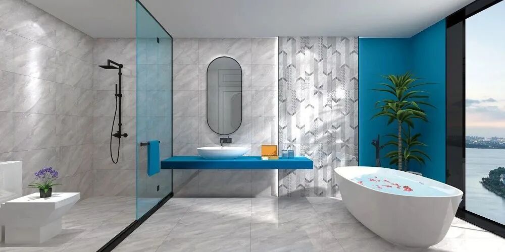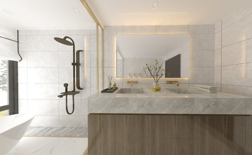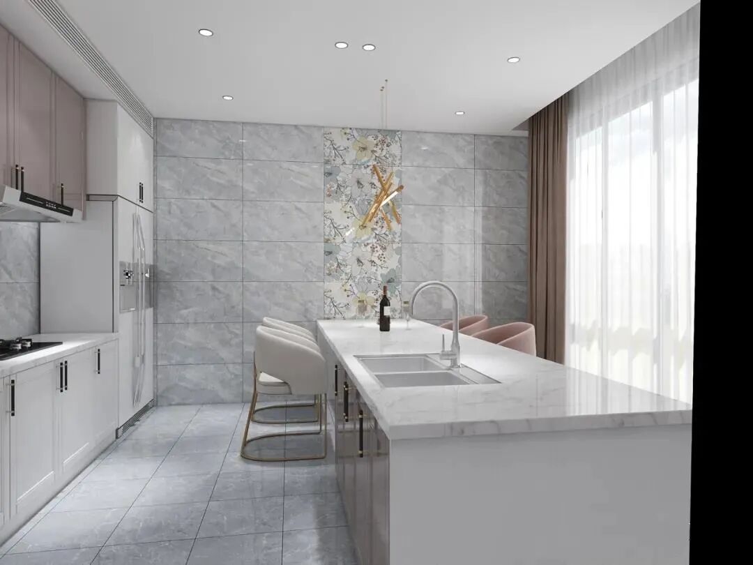 中板能下地,传统瓷片不能下地,而且中板是抛釉技术,完全可以做到和地砖形成墙地一体的铺贴效果。800×800mm砖吸水率低,上墙需加工;薄板表面局限于平面,不能做异型磨具、倒边等工艺;瓷片吸水率高,难免有局限性。而中板表面可以用各种工艺呈现,不用后期加工直接上墙,从消费者使用角度来看,极为方便。