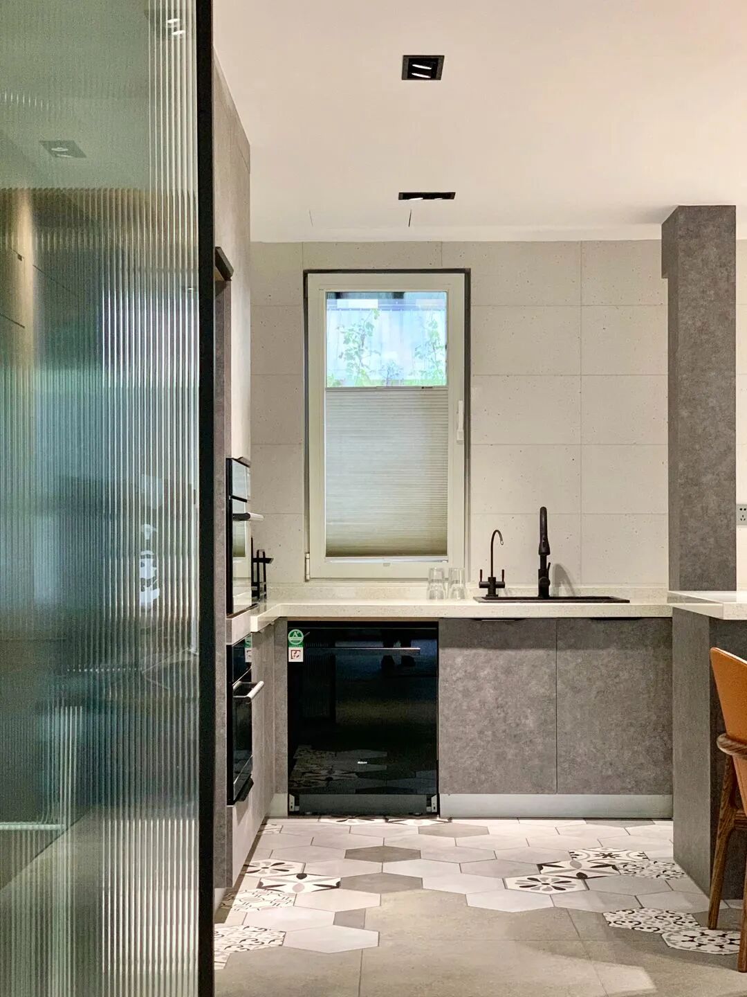 厨房油烟大,墙面使用光亮的抛光砖,日常更好清洁打理;地砖则选择硬度高的哑光防滑砖,不易摔倒。